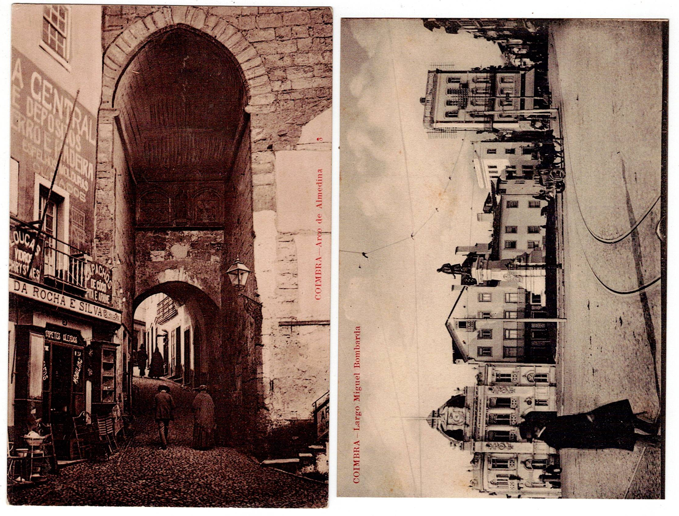 Illustrated Postcards. Polychromatic postcard of Coimbra "Arco d'Almedina" + "Largo Miguel Bombarda".