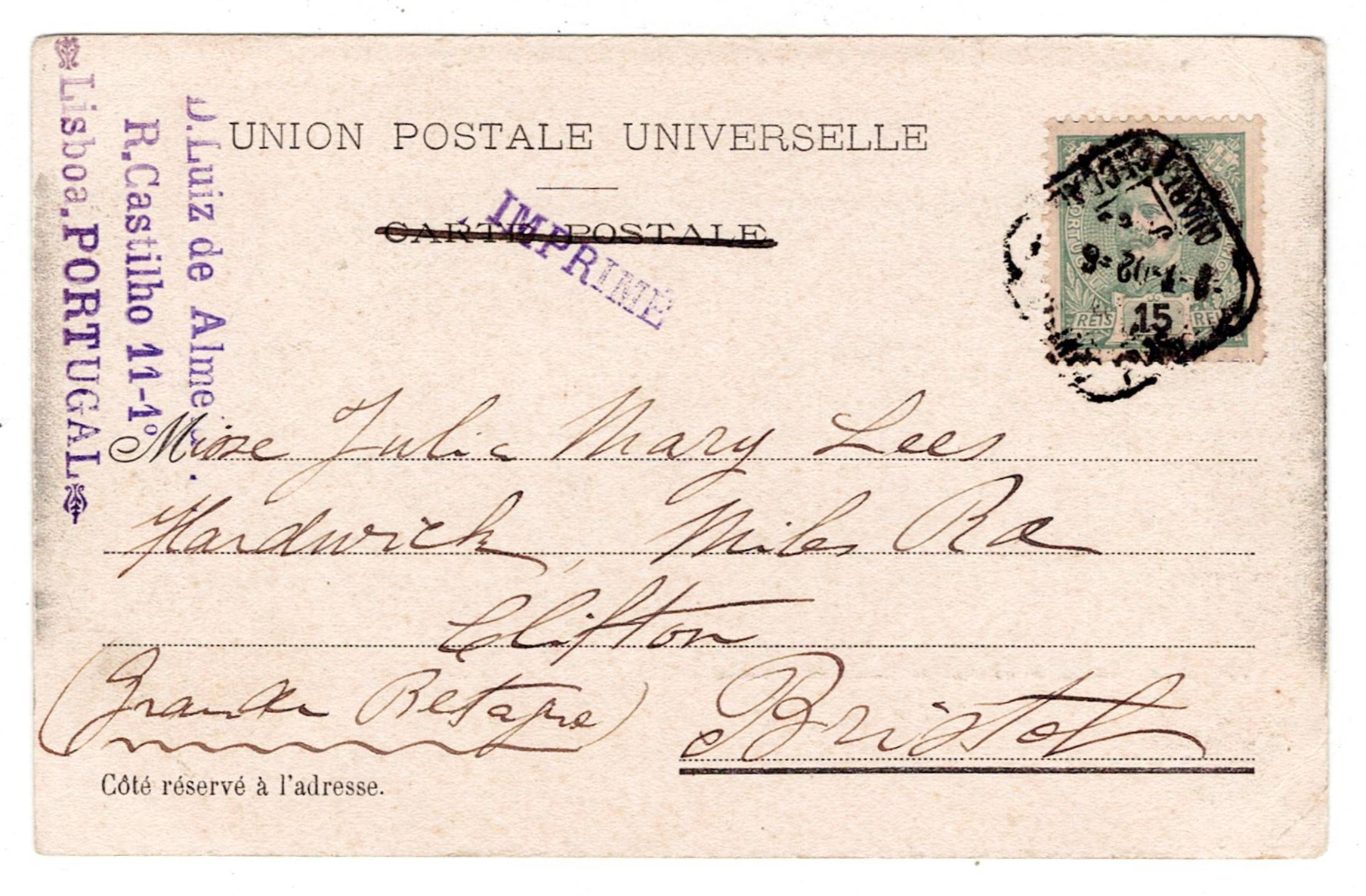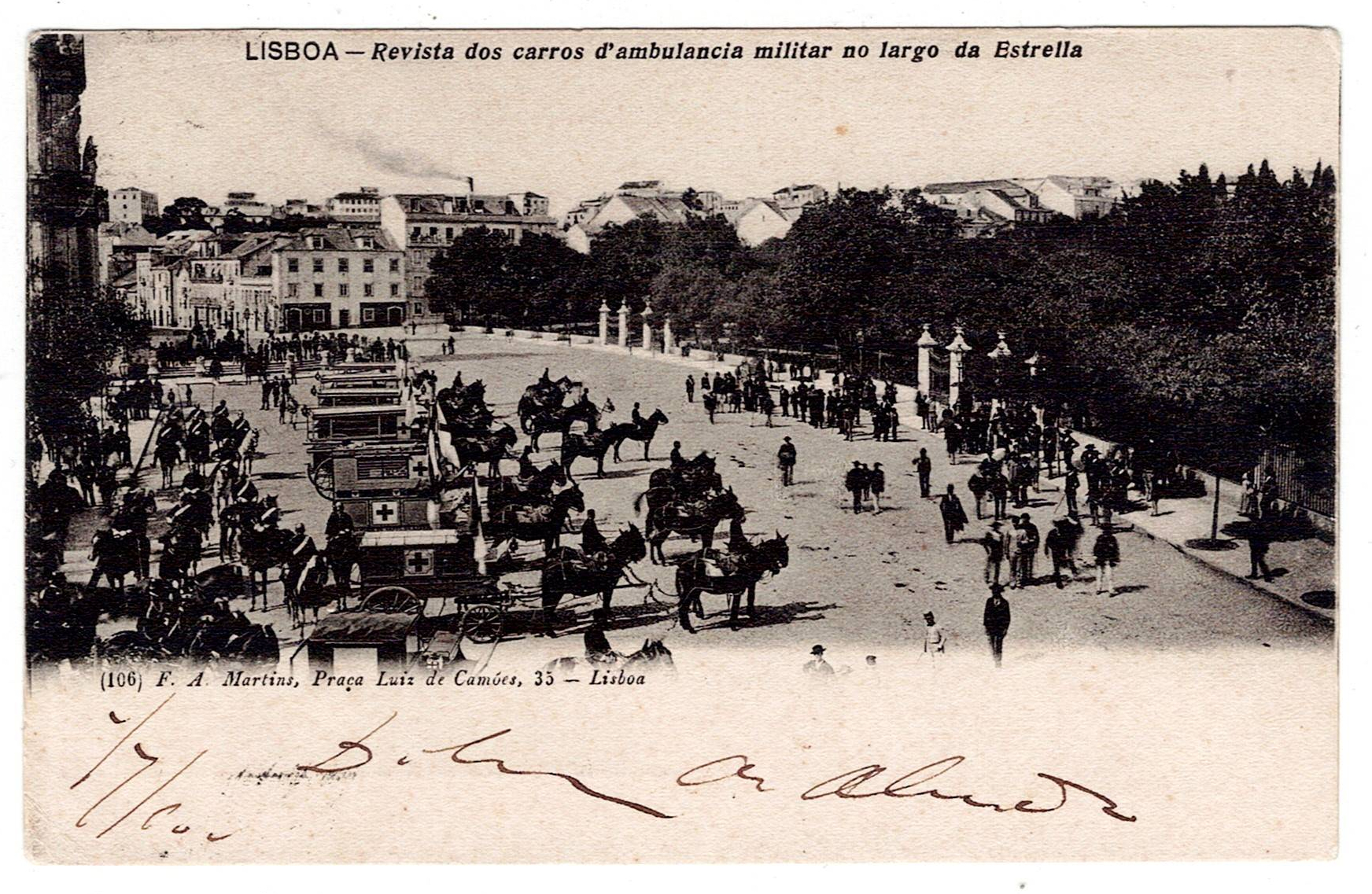 d'ambulancia militar do largo da Estrella" Ed. FA Martins. Circulated in 1902 to Bristol with a 15 reis green D. Carlos Mouchon stamp, well preserved.(Image 1)