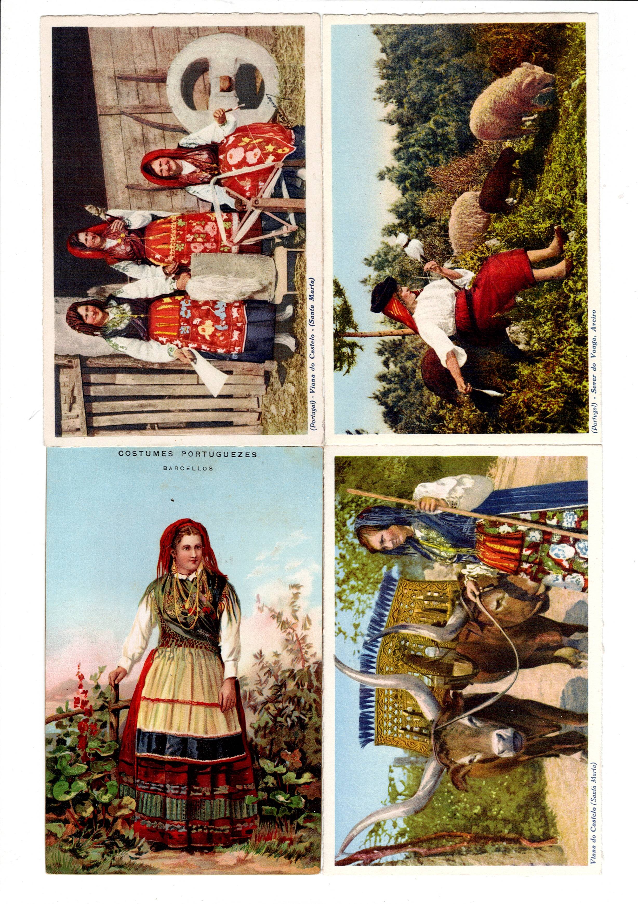 Illustrated Postcards Portugal Costumes. Set of 4 polychromatic costume postcards, all new, including 3