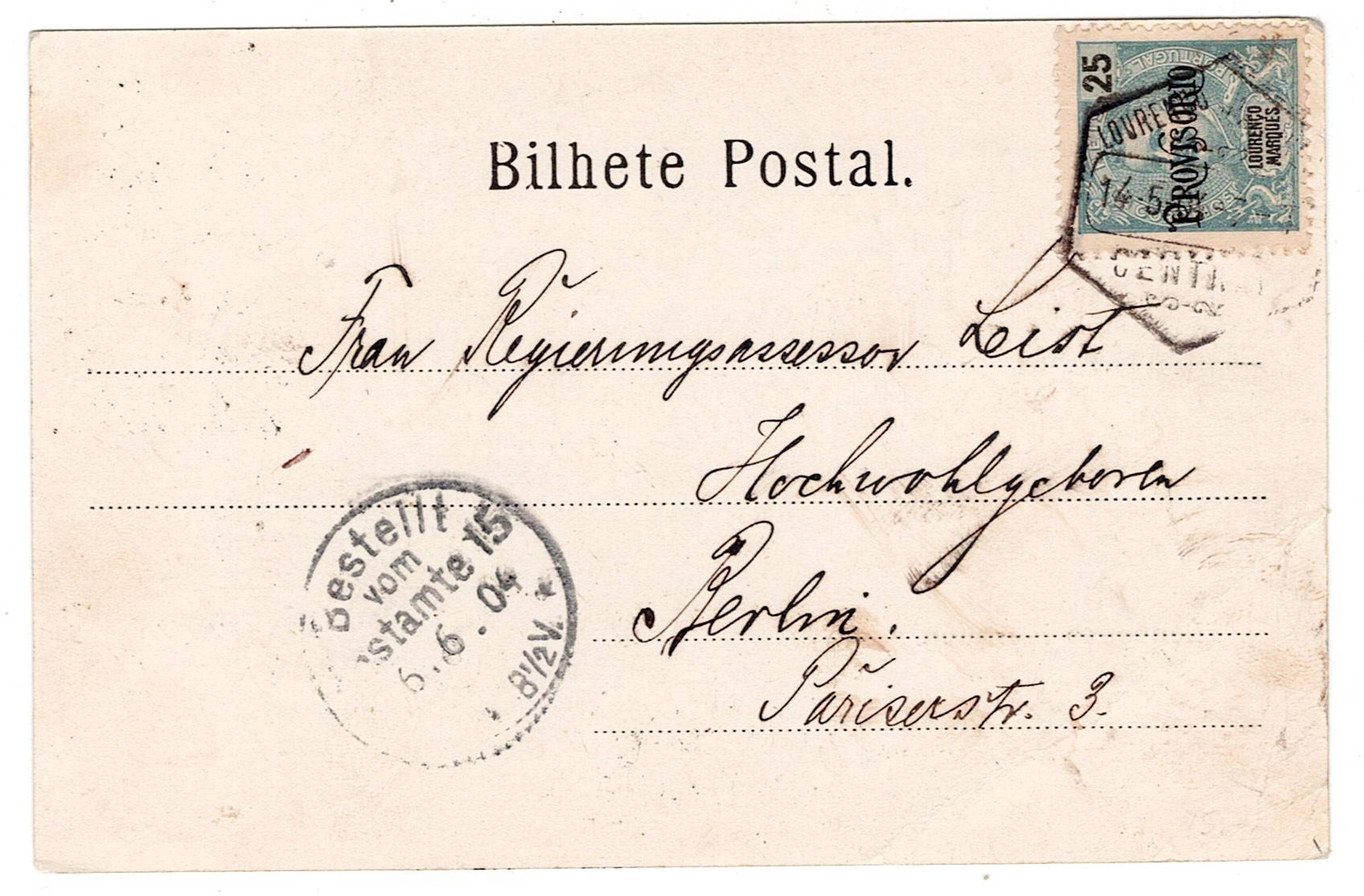 Lourenço Marques, circulated with a Provisional 25 reis stamp, on 14 May 1904 from Lourenço Marques to Berlin (Germany) where it arrived on 6 June 1904. Well preserved.(Image 1)