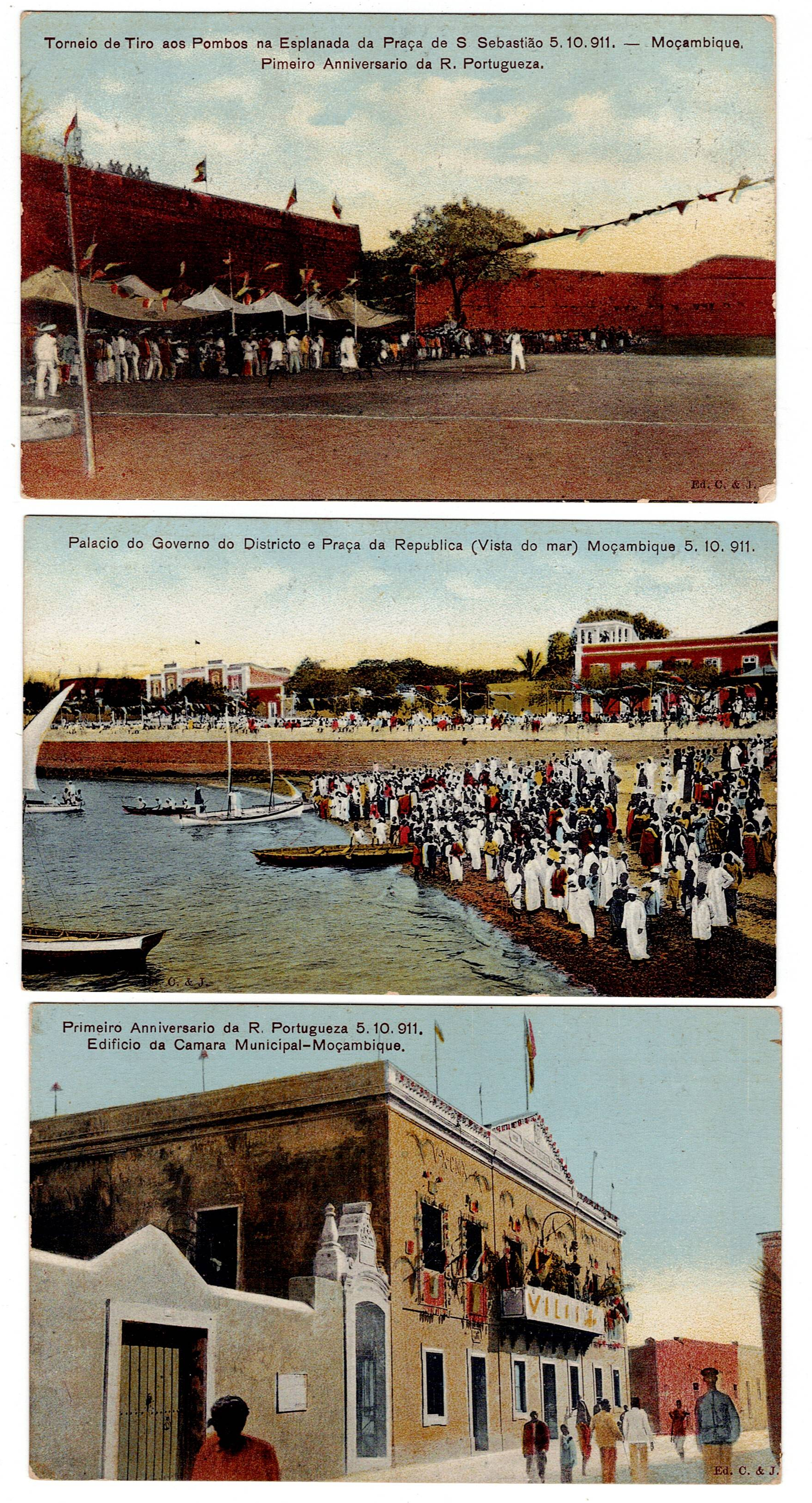 Illustrated Postcards Mozambique. Set of 3 color postcards with views of the First Anniversary