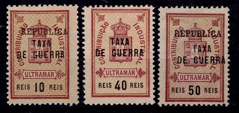 Overseas Tax - War Tax. 3 Overseas Industrial Tax tax stamps of 10, 40, and 50 reis, all with the war