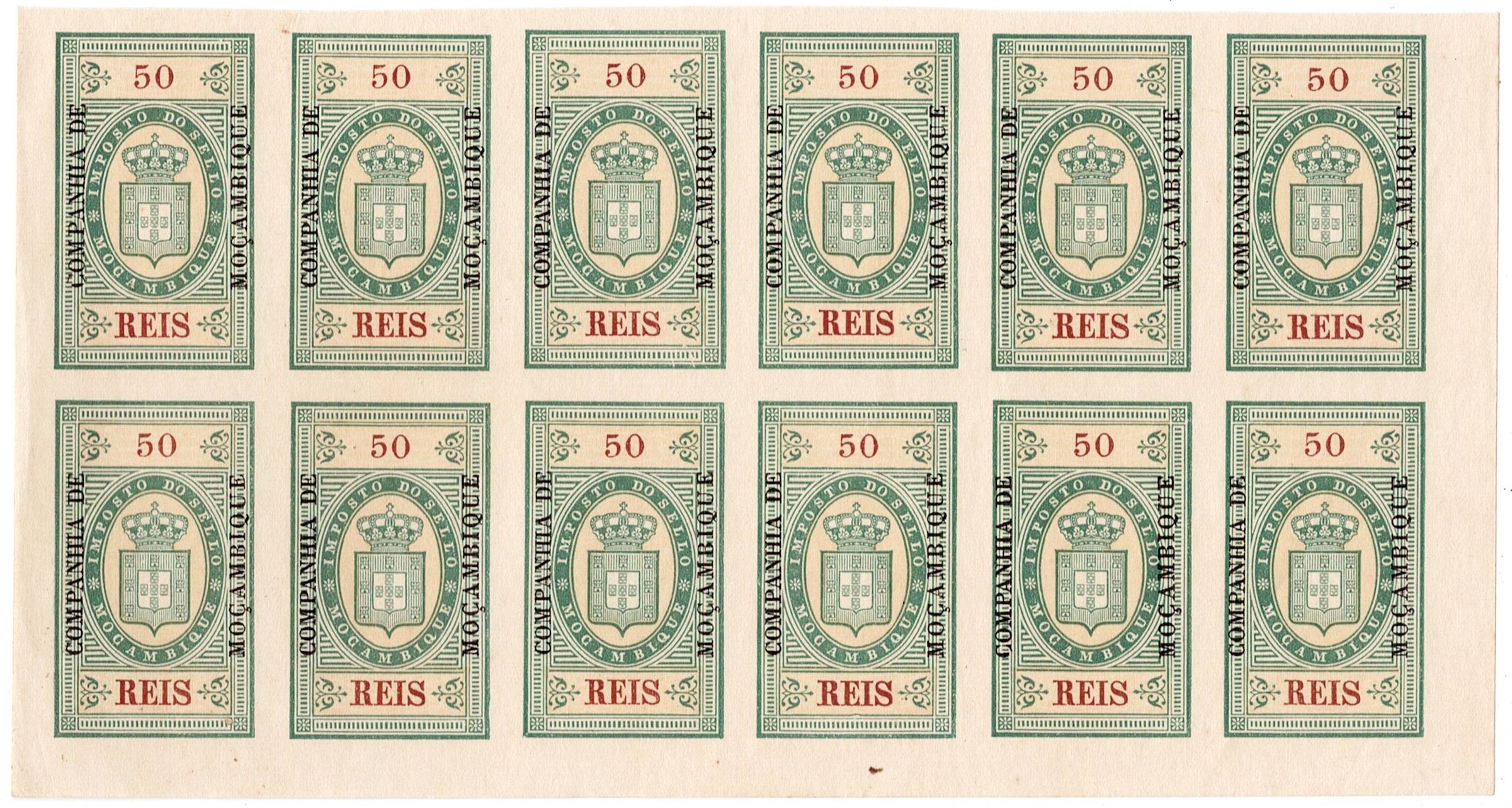 Fiscal Company of Mozambique 1892 – Stamp Tax. PB#IS5. Horizontal block of 12 stamps of 50 réis, new