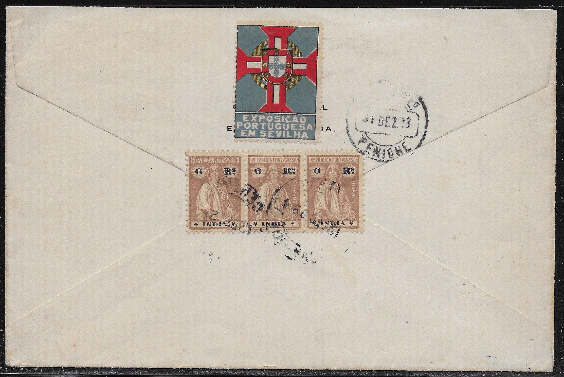 Ceres issues (CE 261). Partial “Nova-Goa” postmarks tie the stamps and a “Peniche” arrival CDS. The back also has an advertising label for the Portuguese Exposition in Seville.(Image 1)