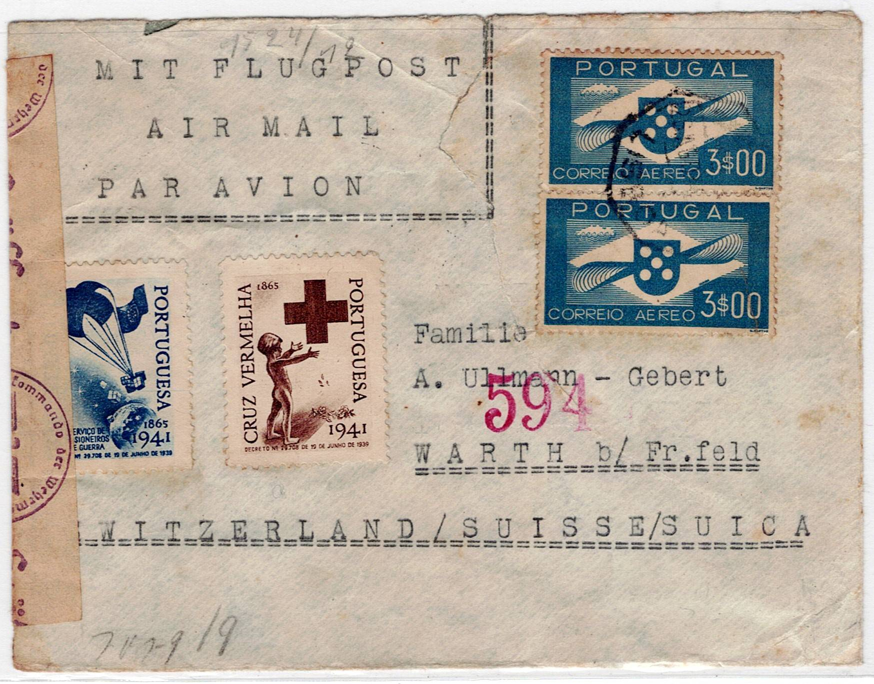 Airmail. Portugal. Letter sent from Lisbon by airmail to Switzerland, postage of 6$00 (pair of 3$00