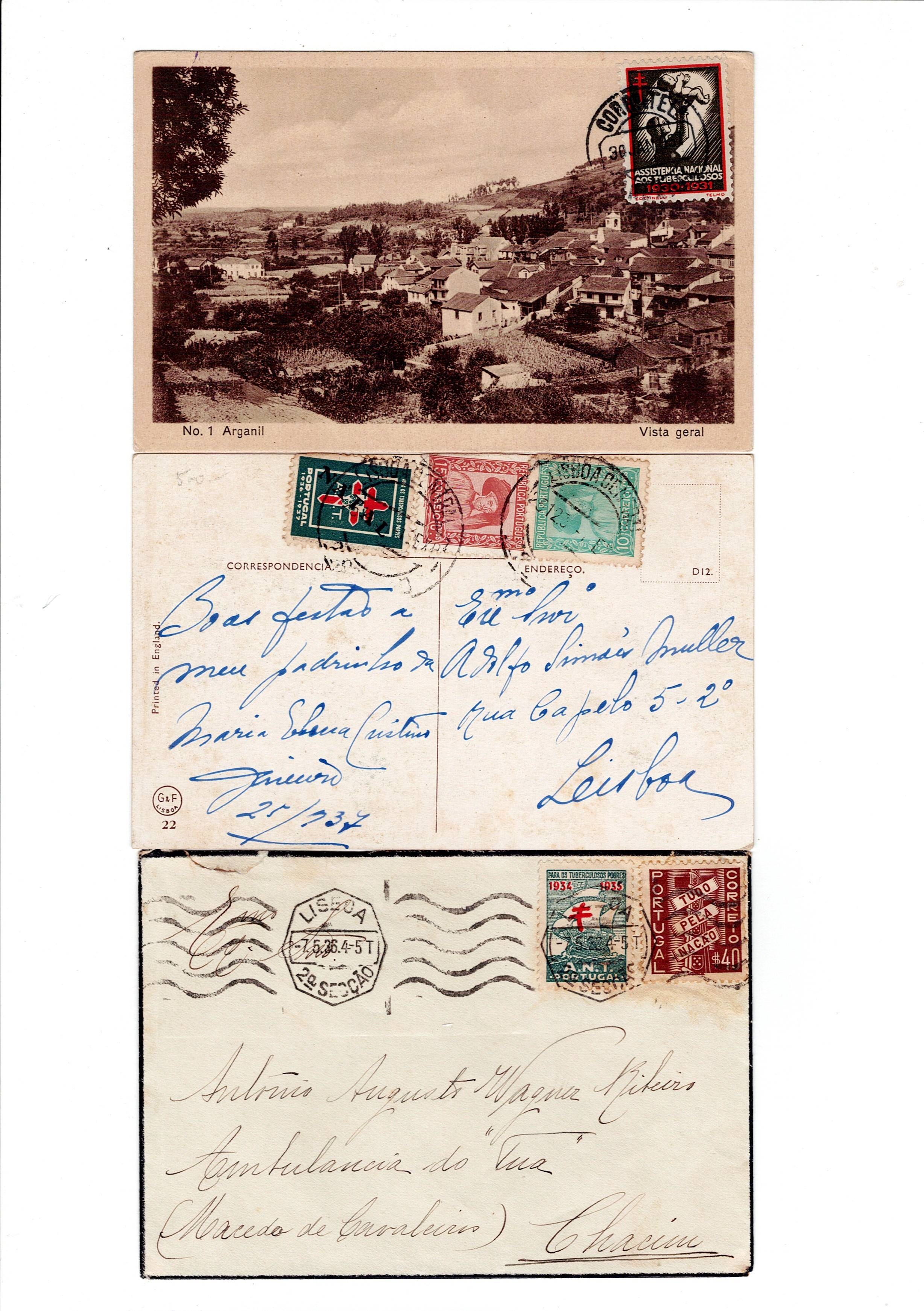 Portugal stickers. Curious set of 2 postcards + 1 envelope with ANT stickers stamped in the 1930s.(Image 1)