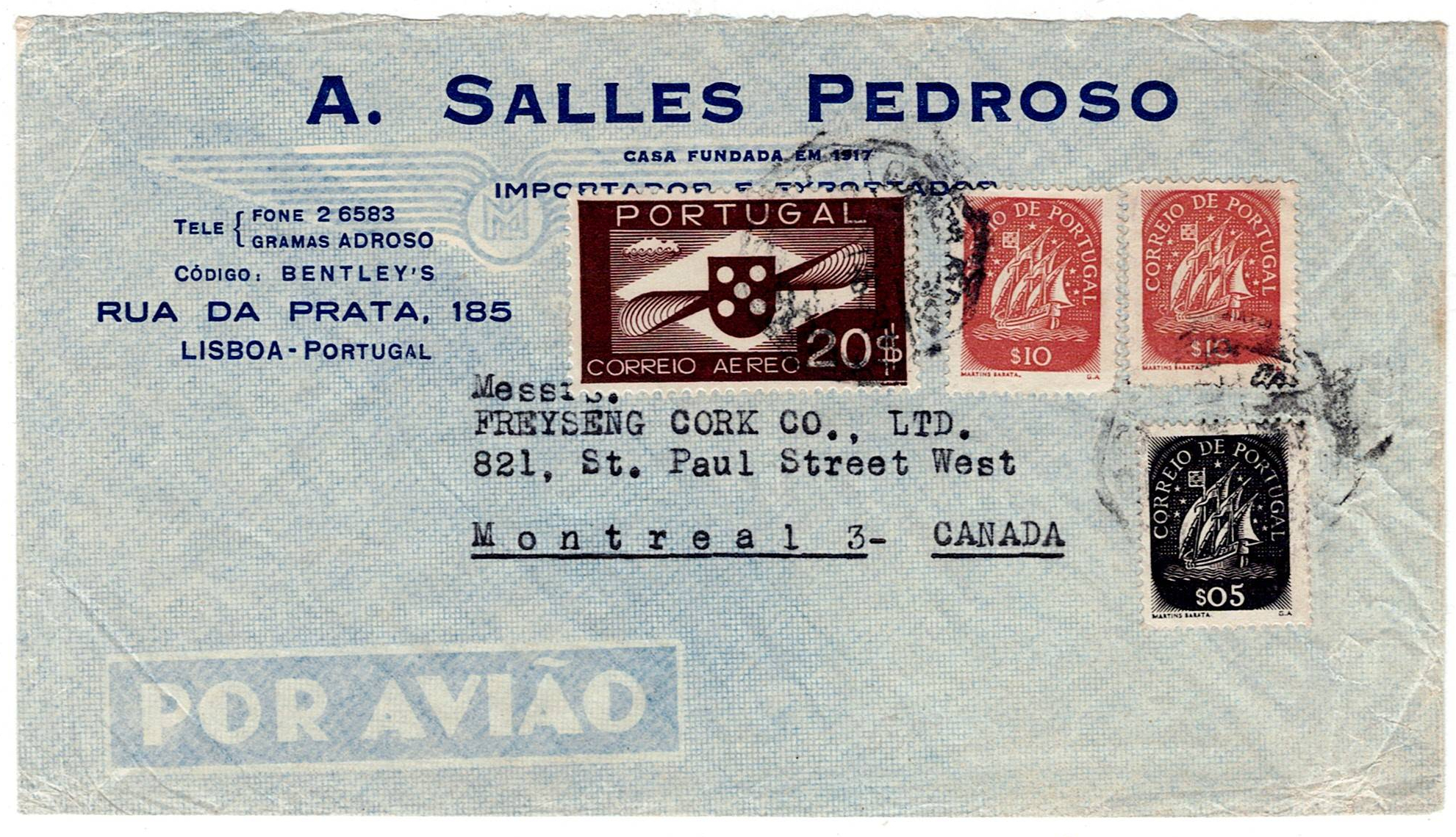Airmail. Portugal. Letter sent from Lisbon by airmail to Canada, postage of $20.25, stamp of $20.00