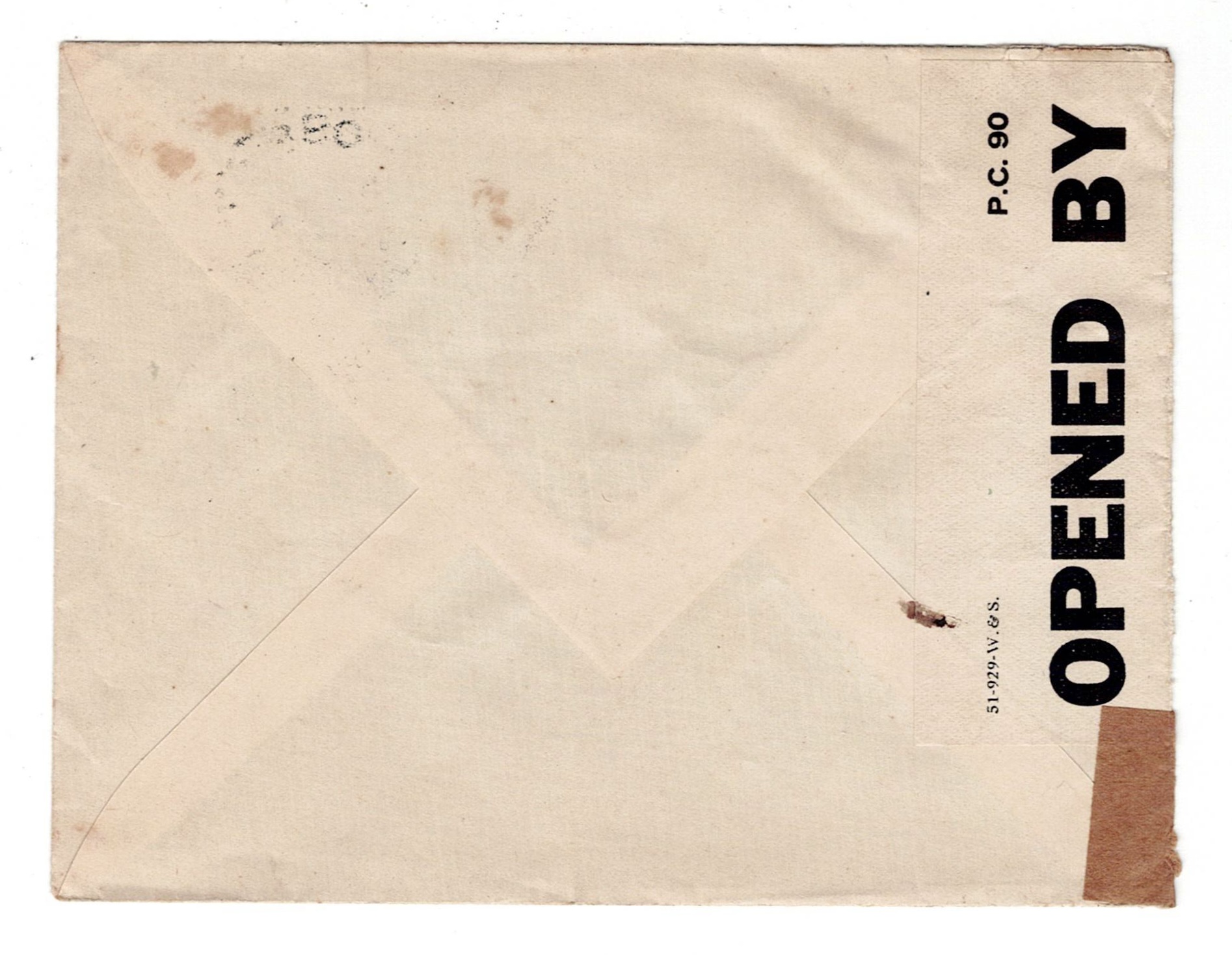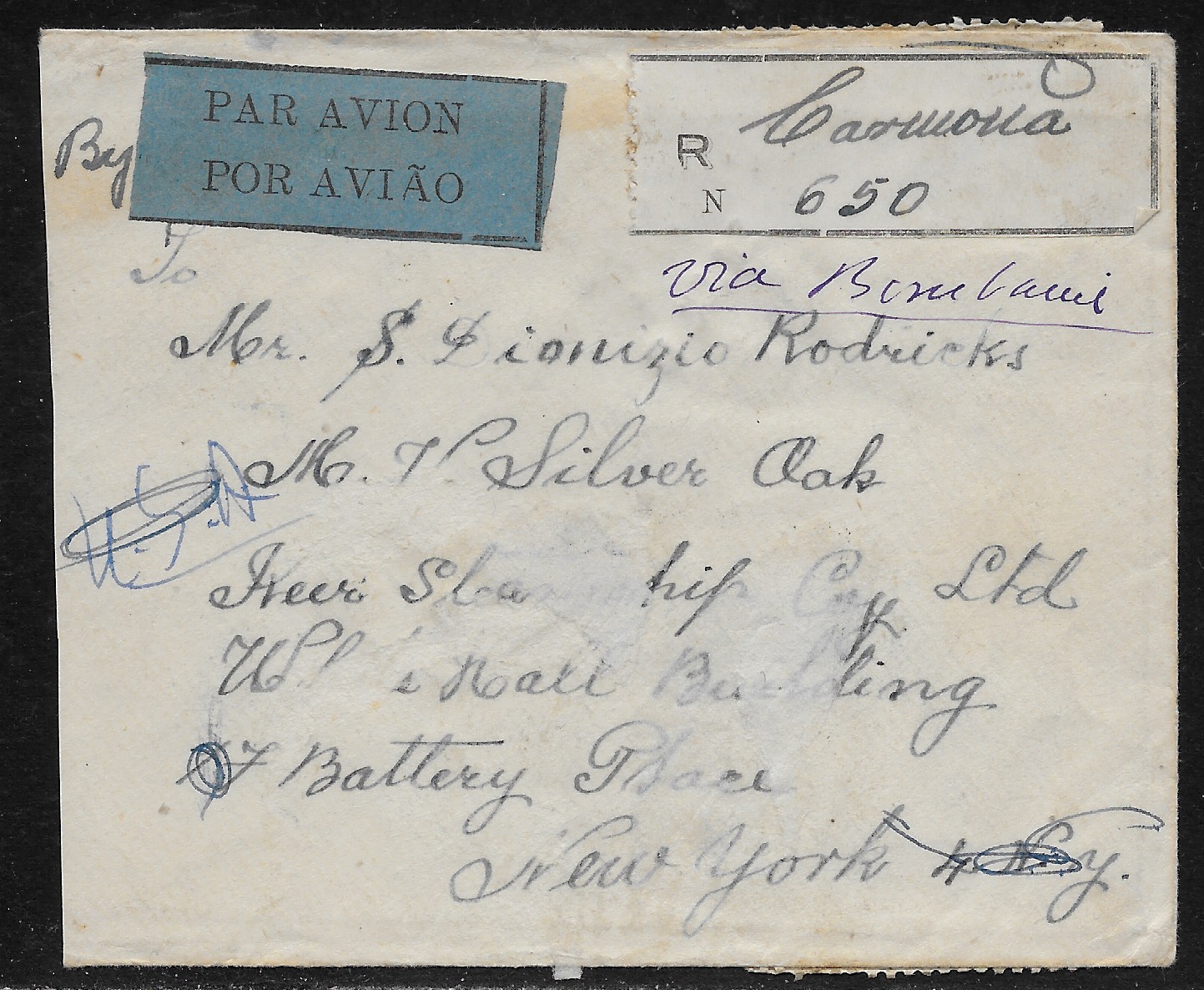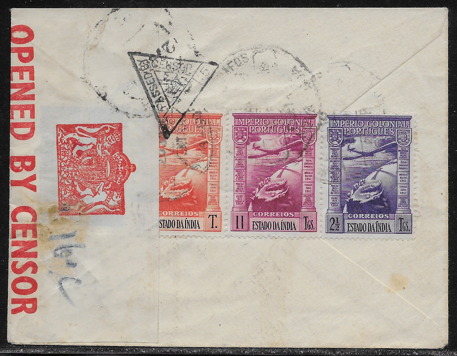 4 airmail Imperio issues: 1 tanga (CE 1), 2 1/2 tangas (CE 2) and a 11 tangas (CE 8). Another stamp is completely covered by the censor tape. Registration and airmail labels on the front. Black triangular Bombay censor marks “C 15”.(Image 1)