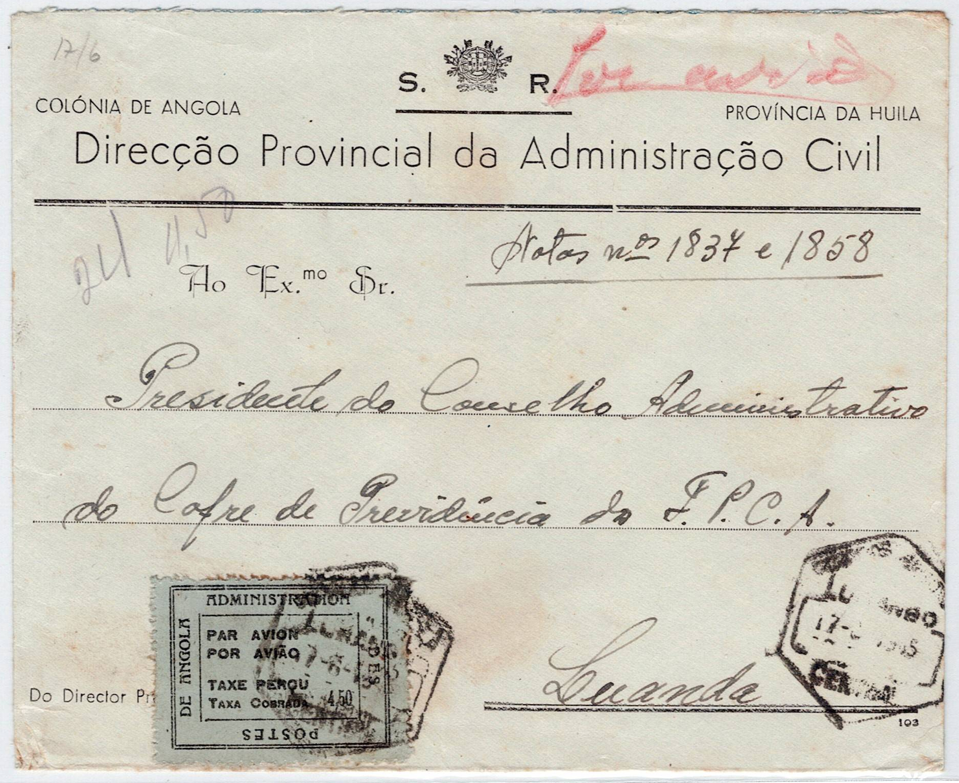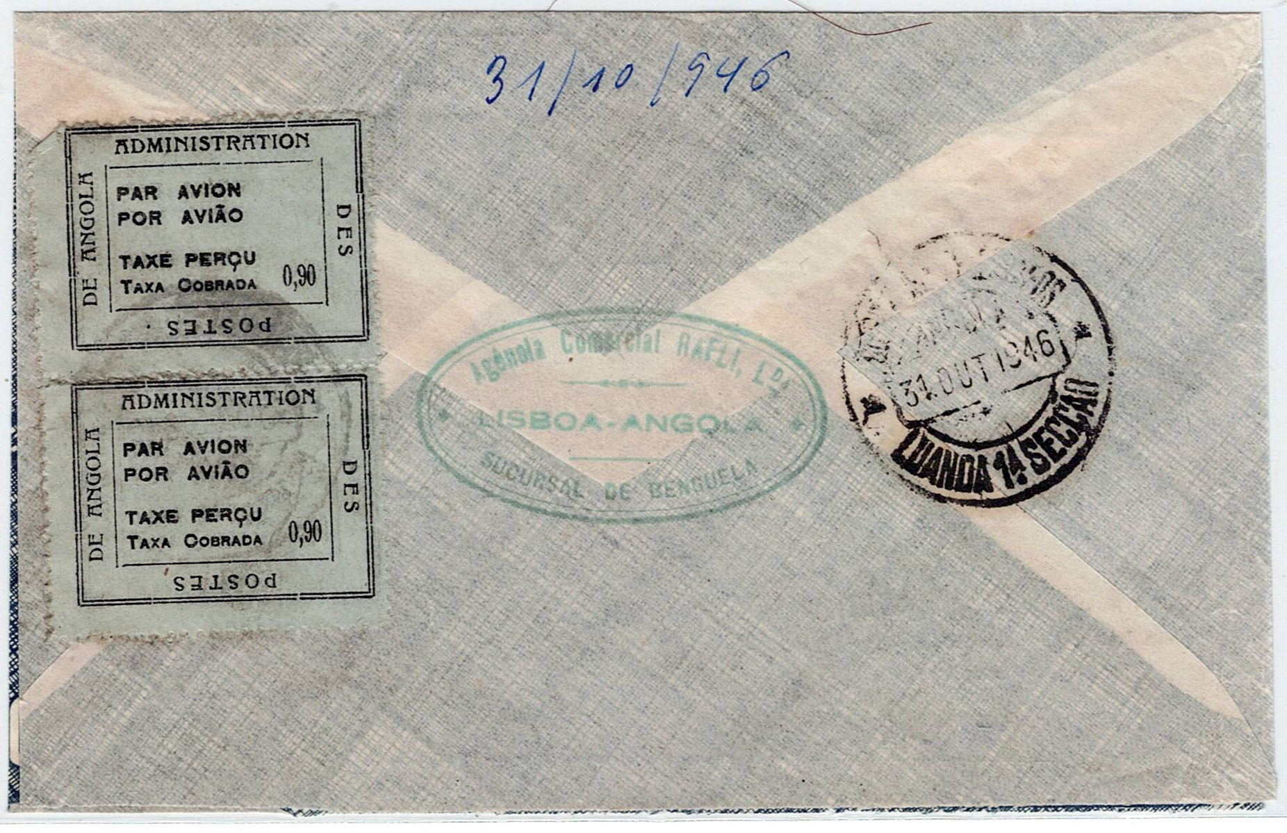 Angola 1946 Airmail. Airmail envelope circulated from Benguela to Luanda in October 1946 with strip of