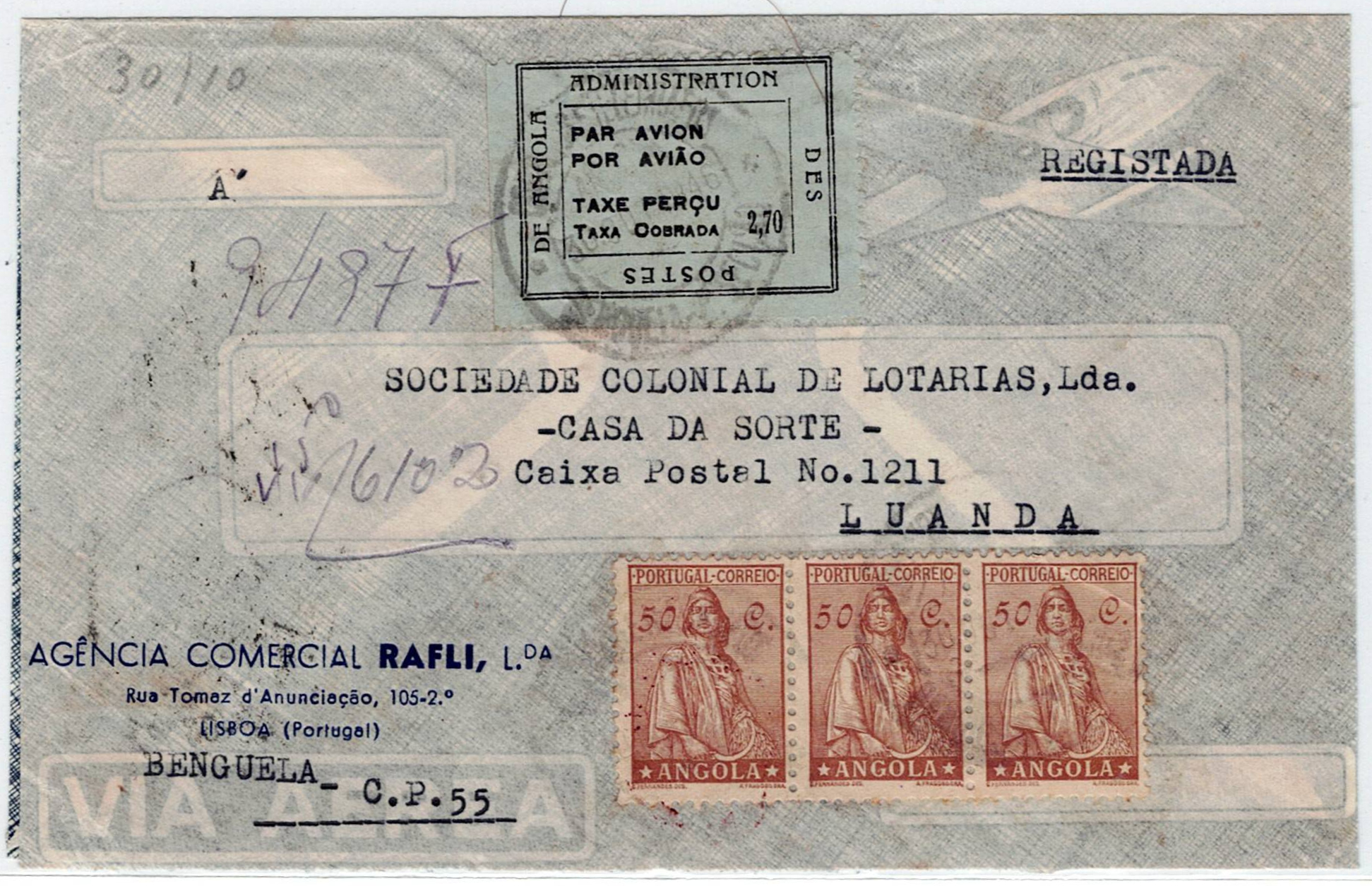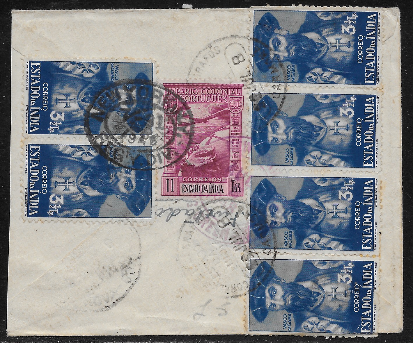 “Nova-Goa” transit CDS. Par Avion label and a Carmona registration label both on the front. Attractive franking.(Image 1)