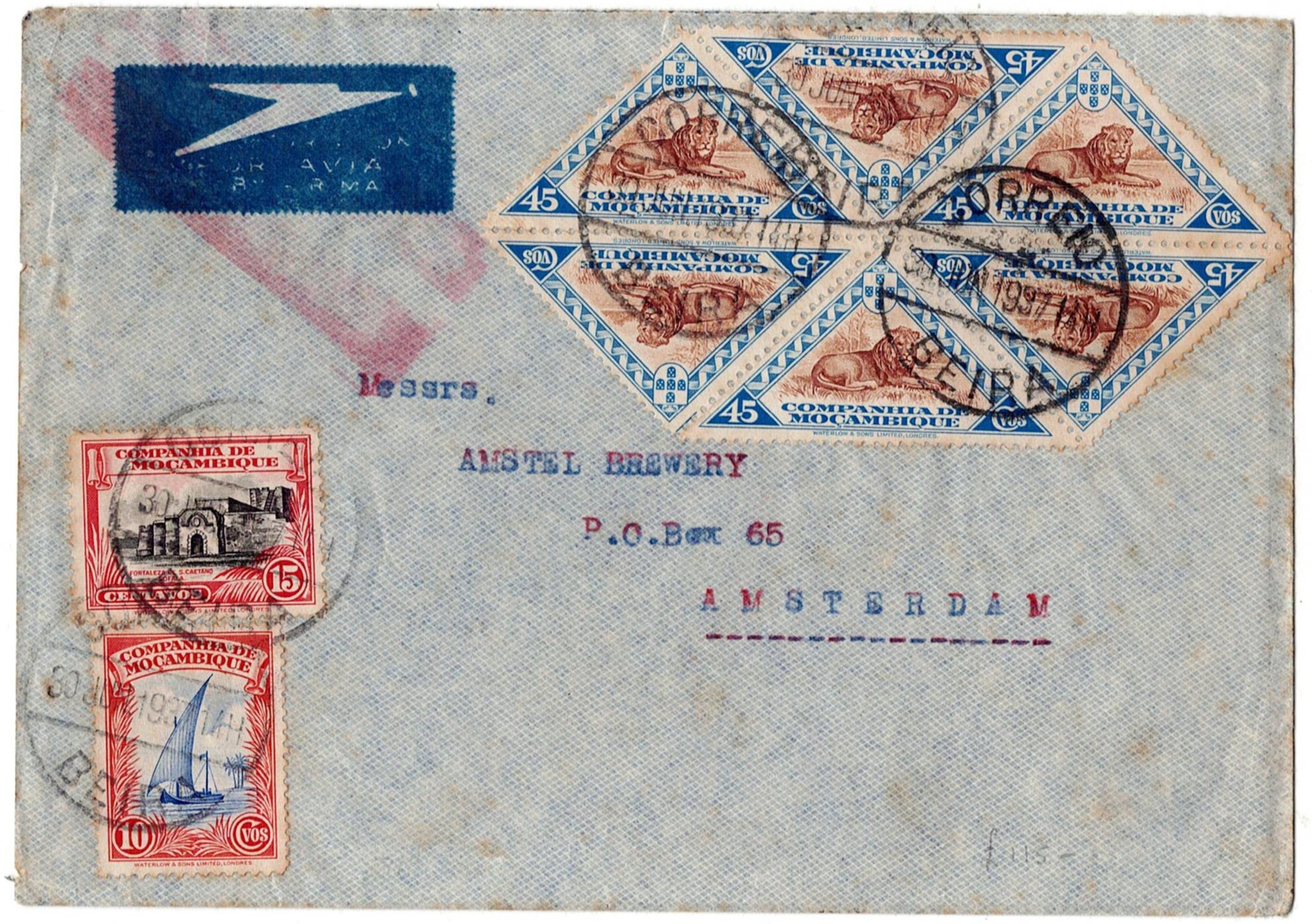 Cª de Moçambique. 1937. Letter sent on 30.6.1937 from Beira, postage of 2$95 consisting of a block of 6