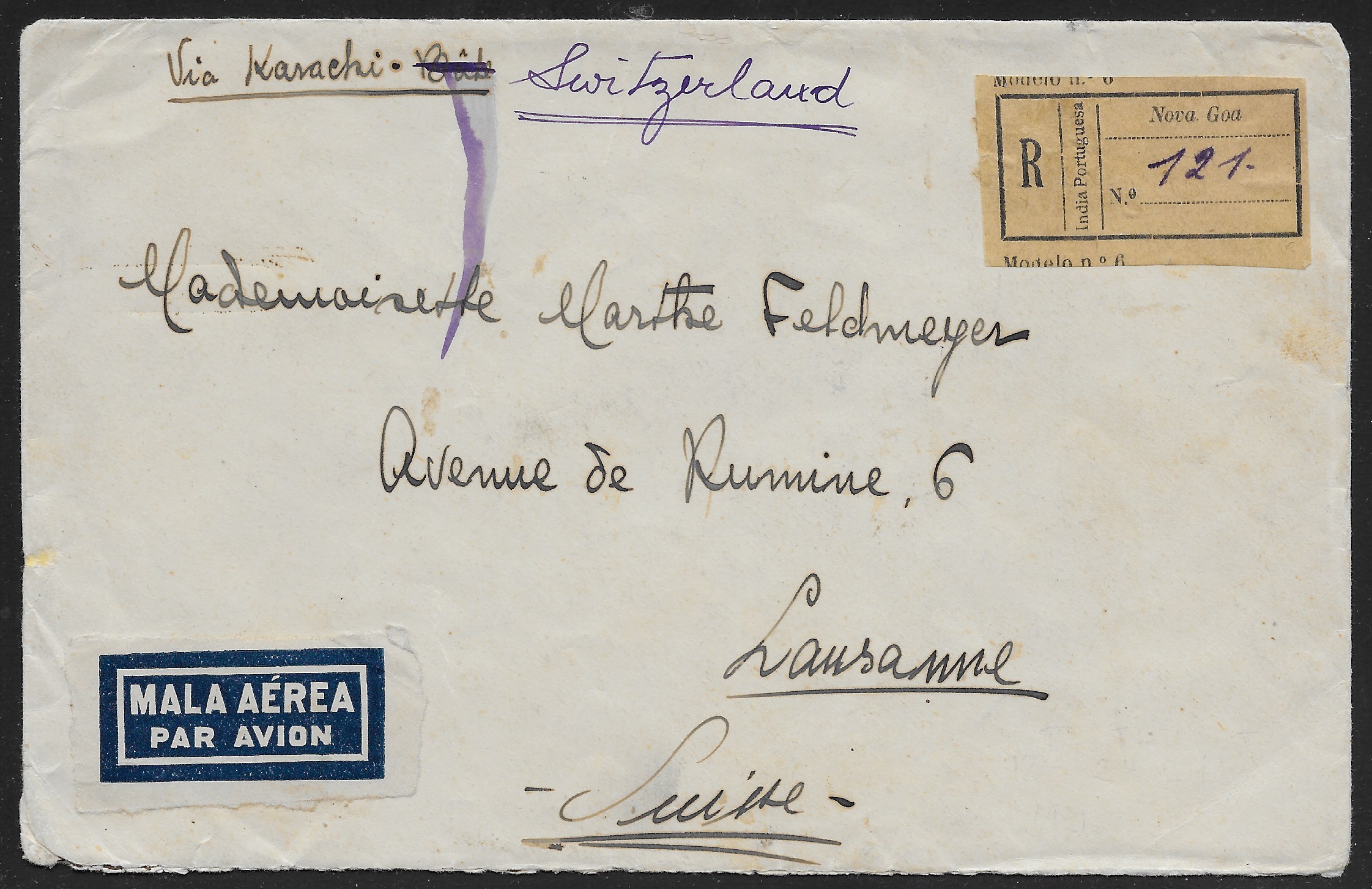 India 1931 Registered air mail cover Nova-Goa to Switzerland. Registration label. Early airmail label.
