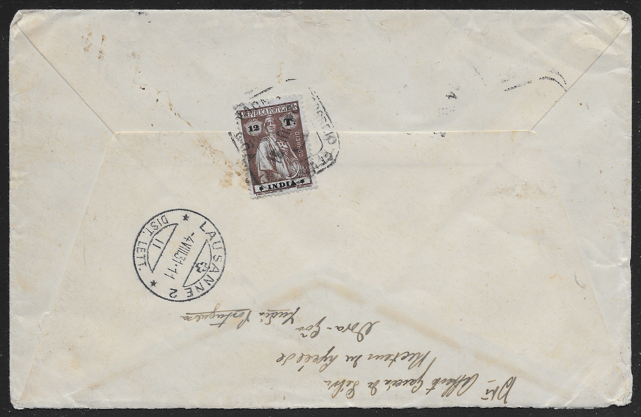Registration cancel and Lausanne Switzerland receiving CDS. 12 tangas Ceres used as airmail postage at correct rate. Rare usage on cover. CE 269.(Image 1)