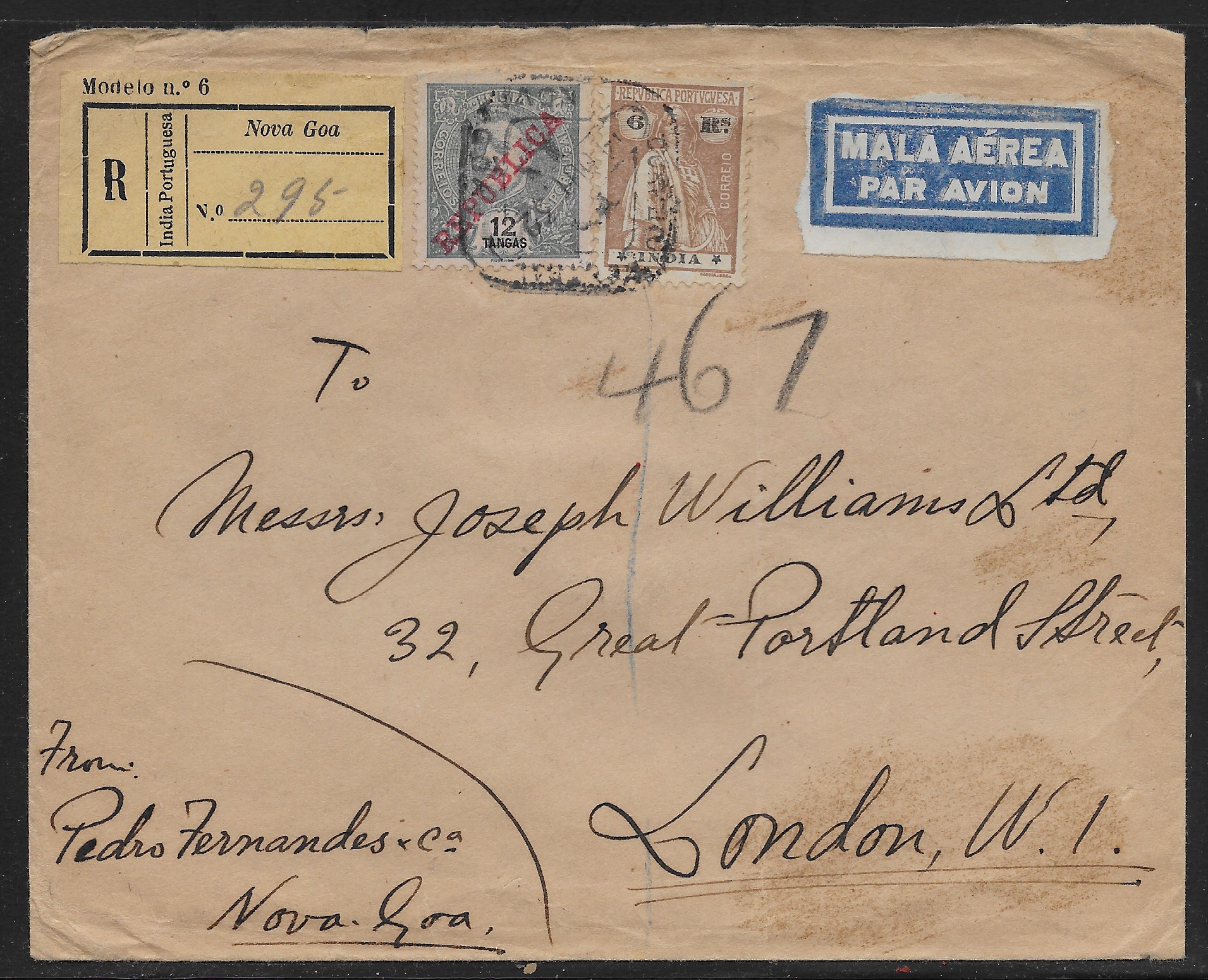 India 1932 registered airmail cover Nova-Goa to London England. Registration label and early airmail