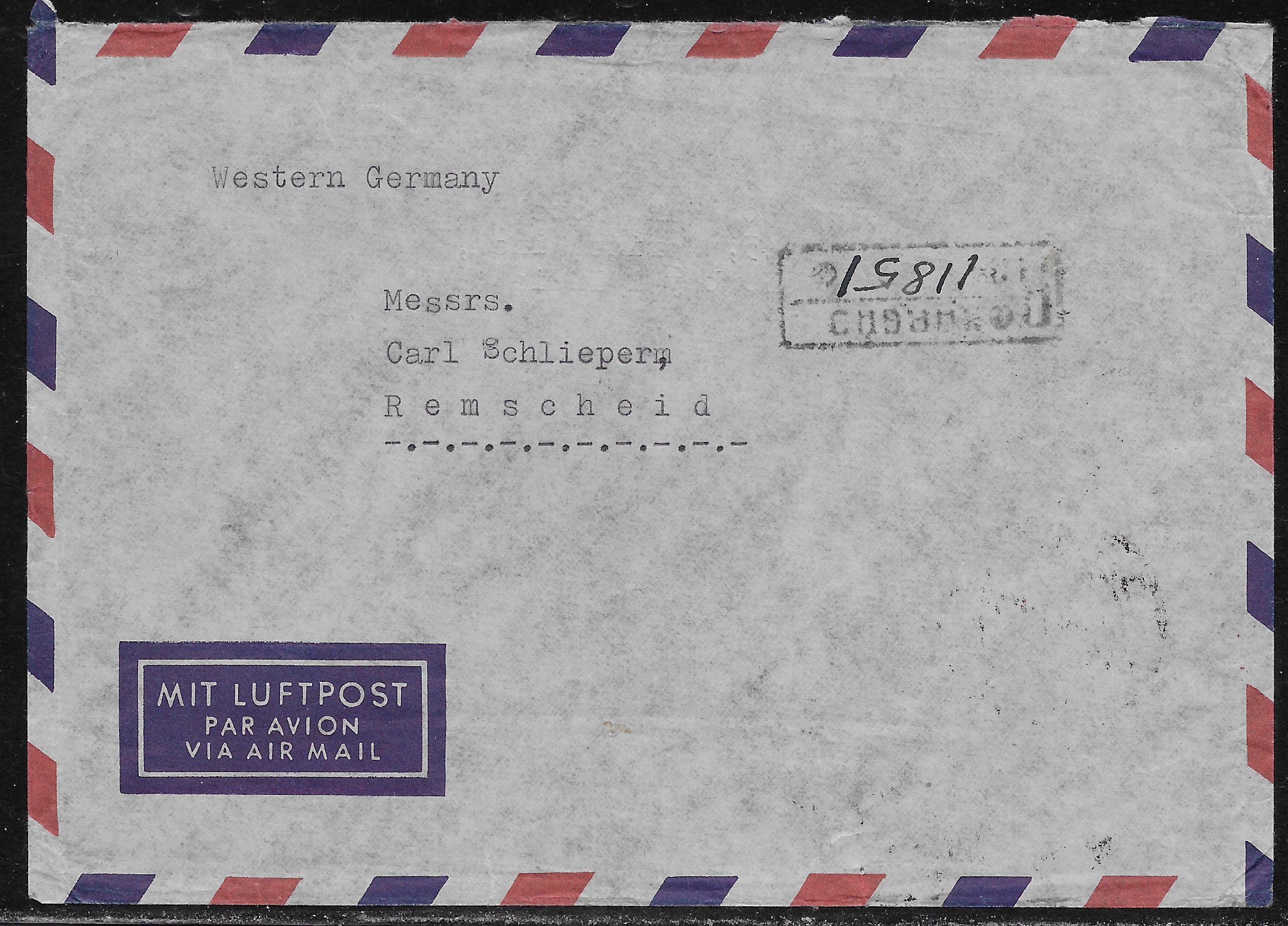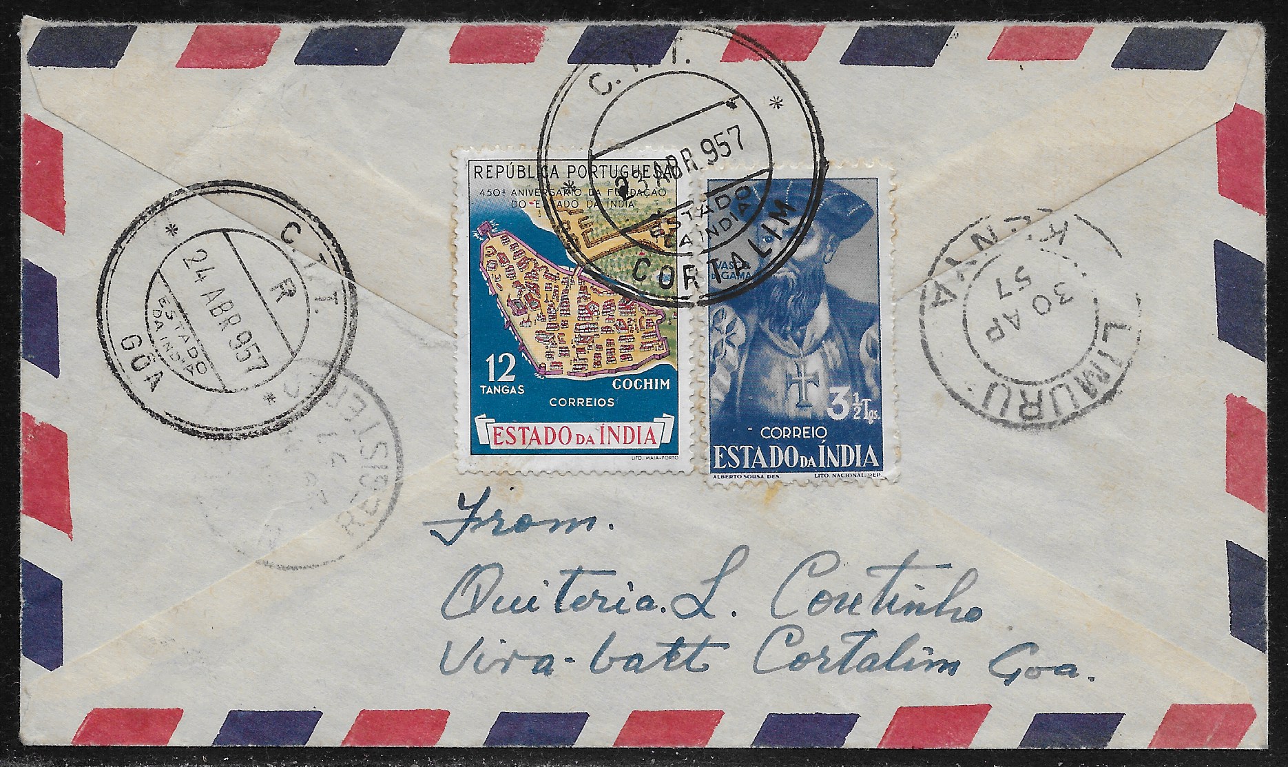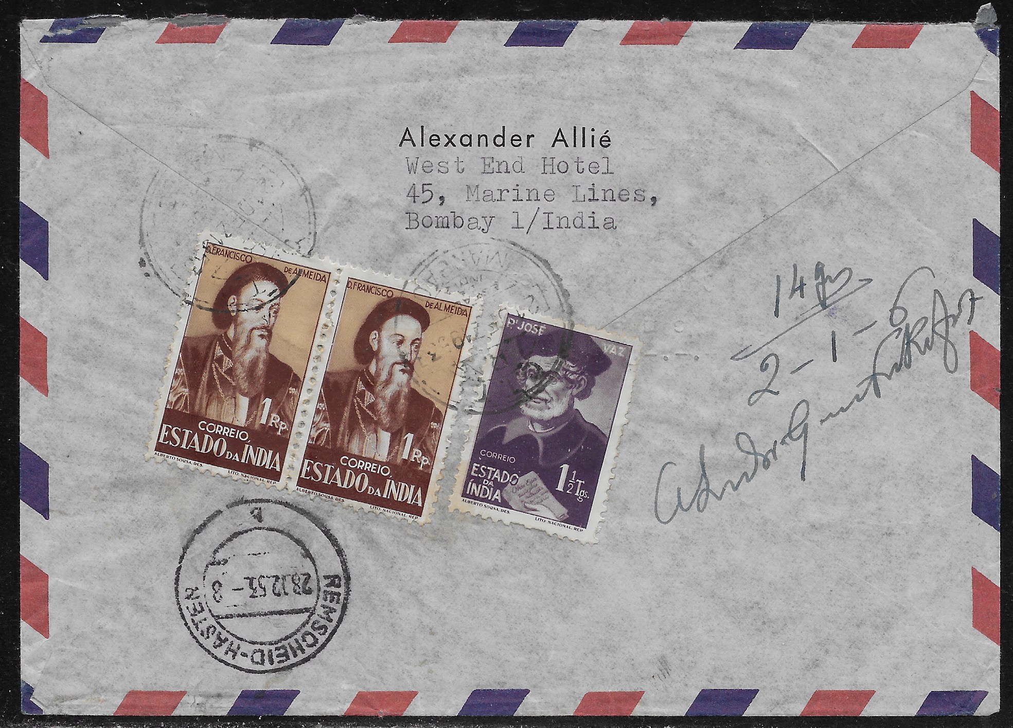 Port. India 1953 registered airmail cover from Margao to Remscheid Germany, franked on the back with a