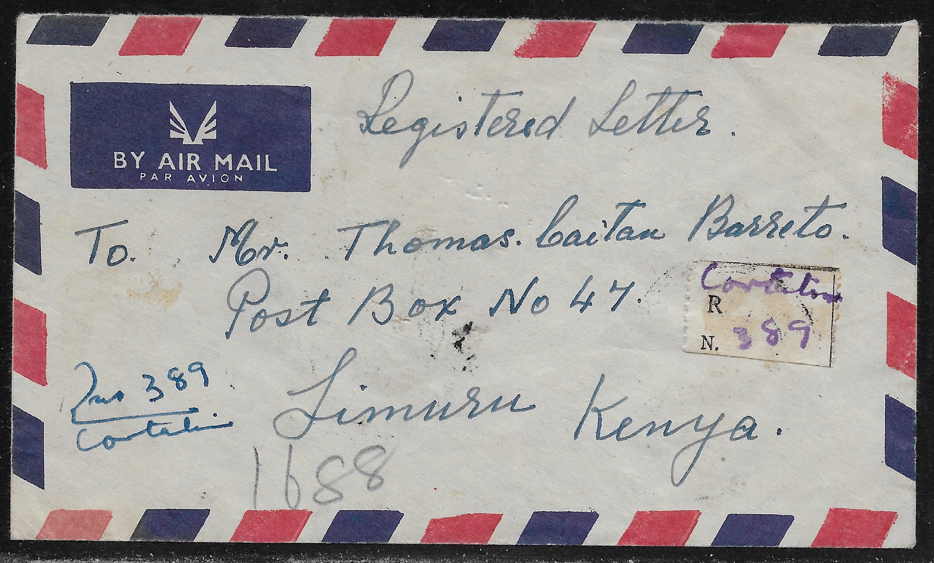 Port. India 1957 registered airmail cover from Cortalim Goa to Limuru Kenya, franked on the back with a