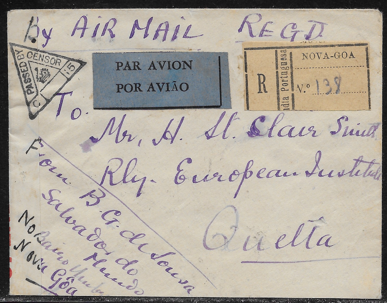 Port. India 1941(?) registered airmail cover from Nova-Goa to Quetta Pakistan franked on the back with
