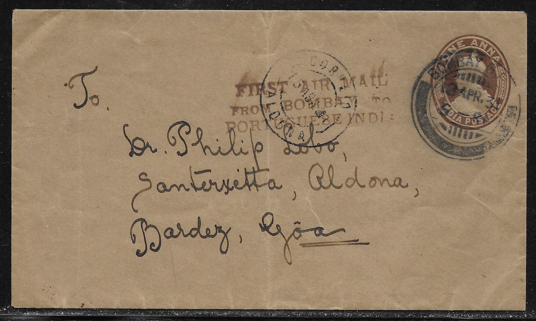 George V stationery envelope. Violet three line cachet “FIRST AIRMAIL FROM BOMBAY TO PORTUGUESE INDIA”. “Bombay” double circle CDS ties indicium, light “Nova-Goa Central” CDS on the back and an “Aldona” village CDS on the front. Vertical creases.