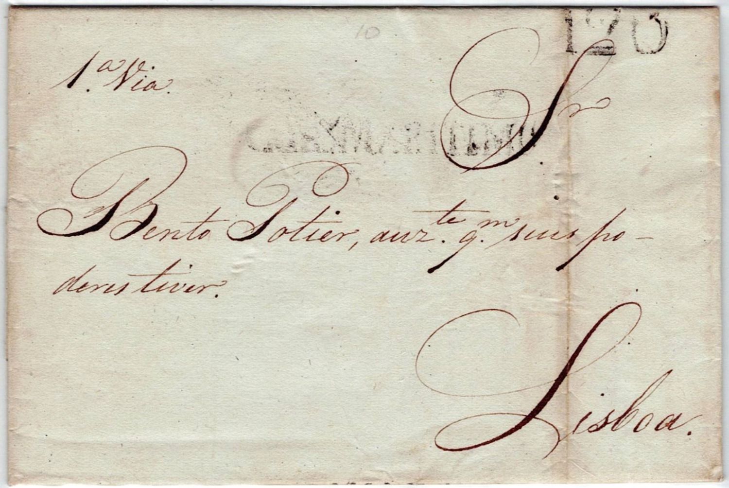 destined for Lisbon, where it arrived on September 9. It was marked with Corº Maritimo de Lisboa LSB-CM1, in black (R5), and postage of 120 reis, for a letter weighing between 4 and 6/8 of an ounce, according to the maritime postal rates. It also has