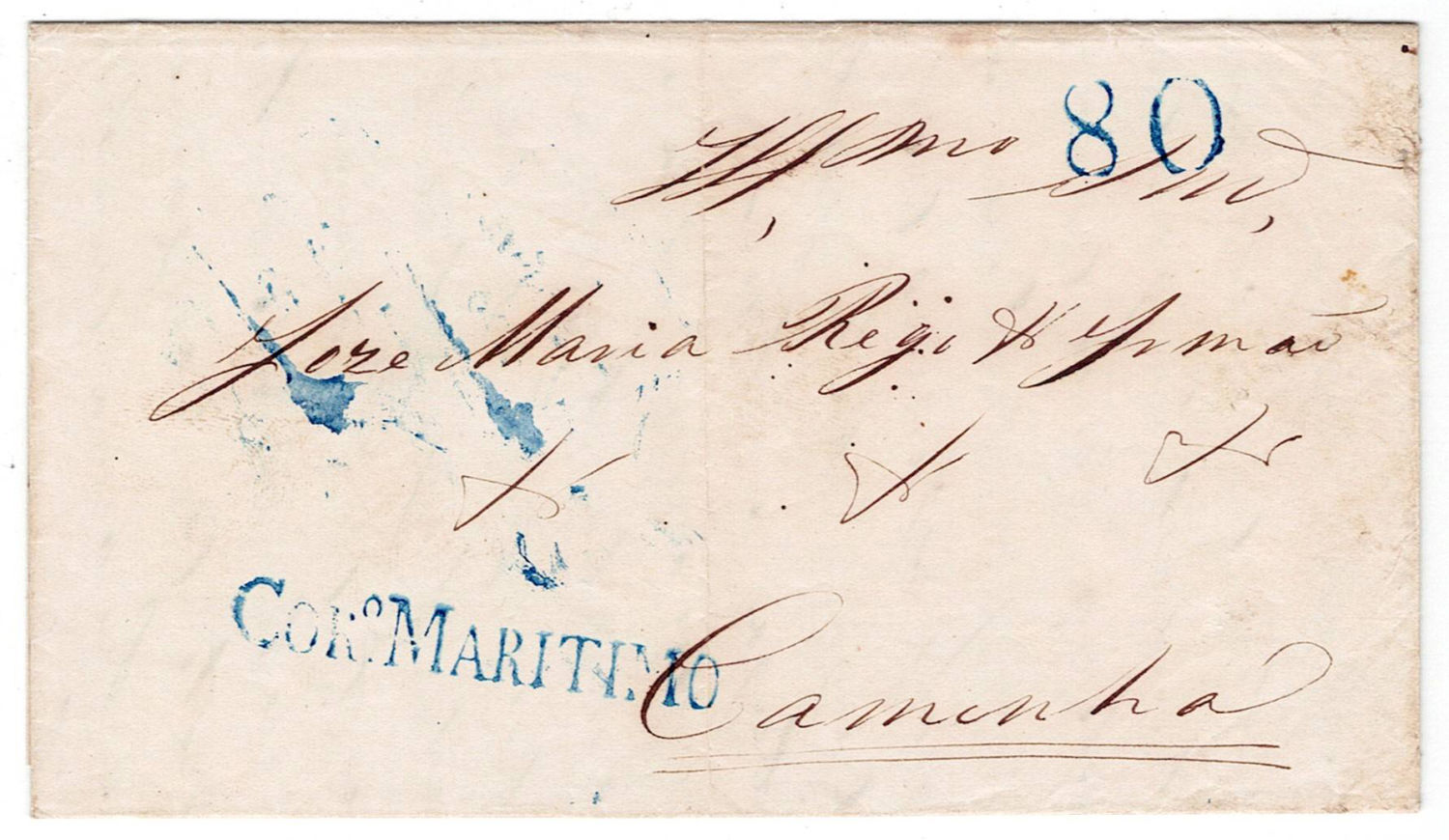 to Caminha. It was delivered on board, continued to Lisbon, where it was marked CORº MARITIMO, the postage of 80 reis applied and the date stamp dated 6 January 1853 on the reverse. Letter MB and R.(Image 1)