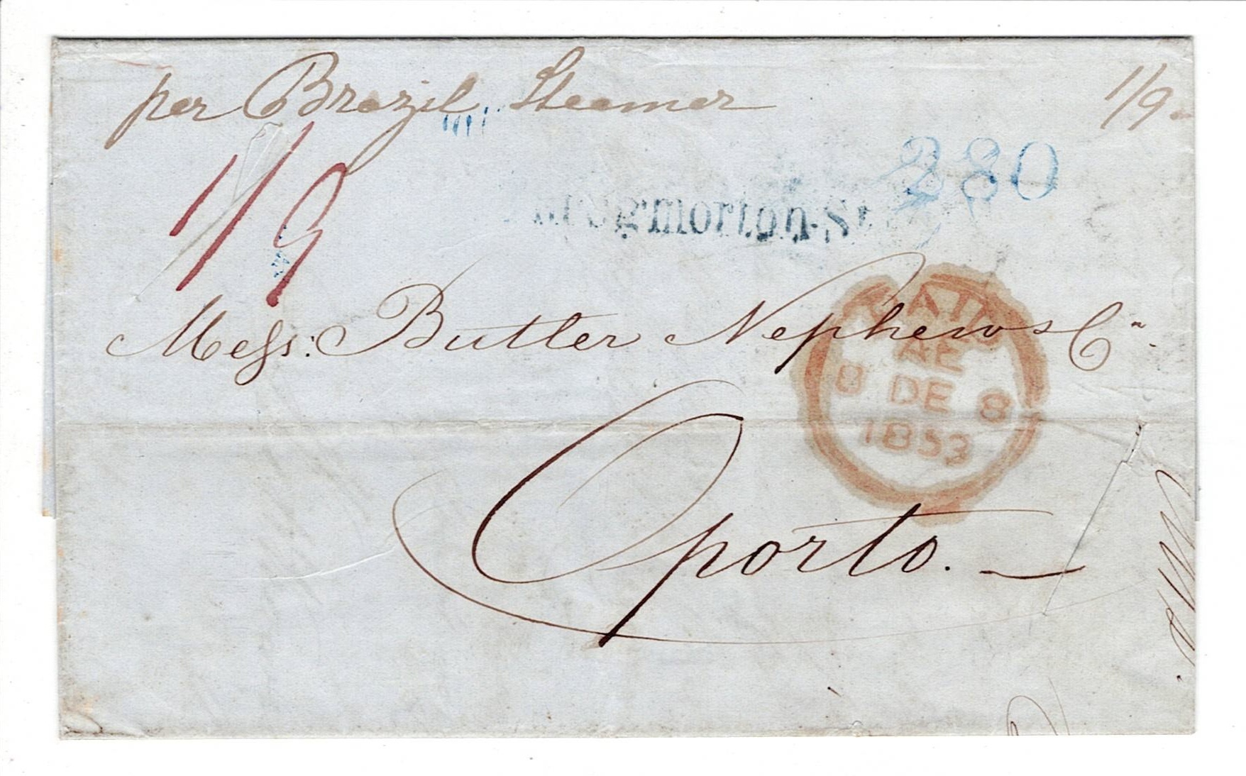 Maritime Mail. Brazil. Letter from Baía 17.10.1855, by “Tamar”, transported by hand, released in the