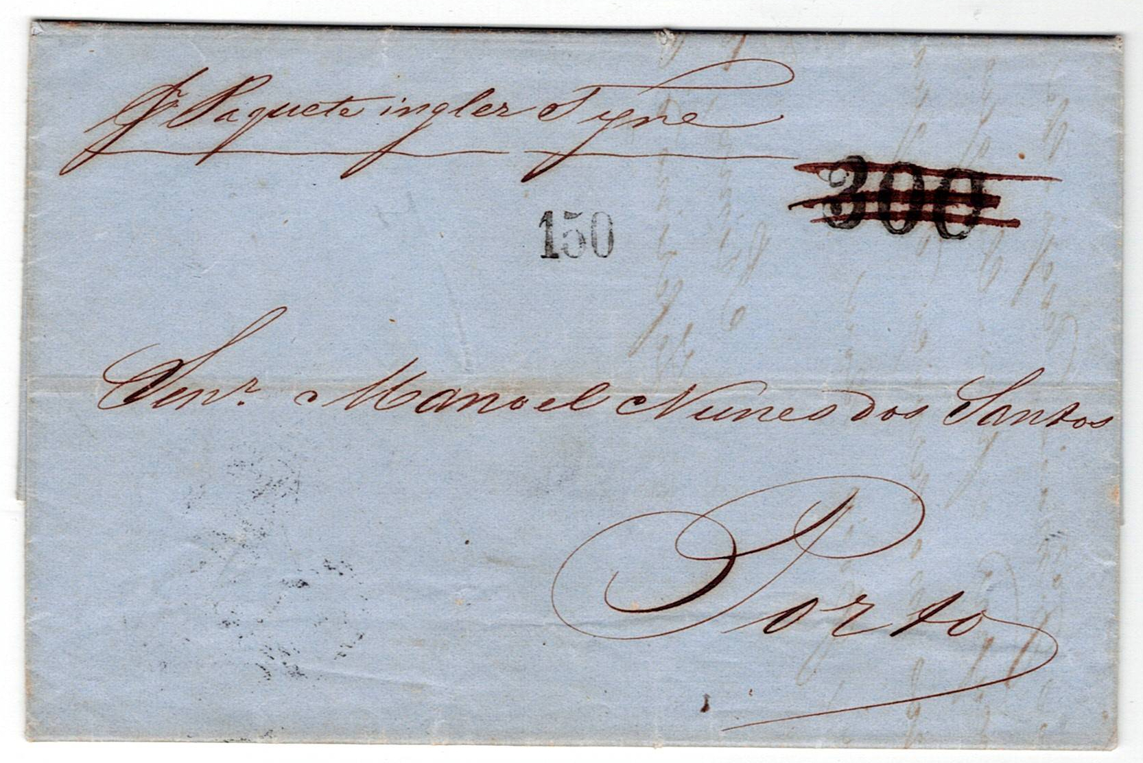 1302 imageMaritime Mail. Brazil. Letter from Rio de Janeiro 7.1.1861, by the English packet TYNE to Lisbon, postage of 300 reis, amended to 150, arrival mark of the transatlantic packet of 2.2, arrival in Porto at 4.2(Image 1)