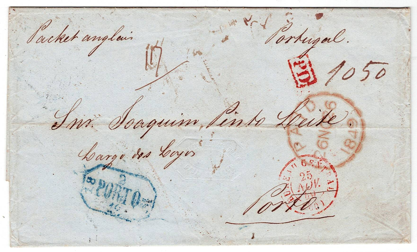 1303 imageSea Mail: France. England. Letter from Paris dated 11/25/1849, via London and packet, to Porto, Portuguese postage of 1050 reis, arrival in Porto on 12/9(Image 1)