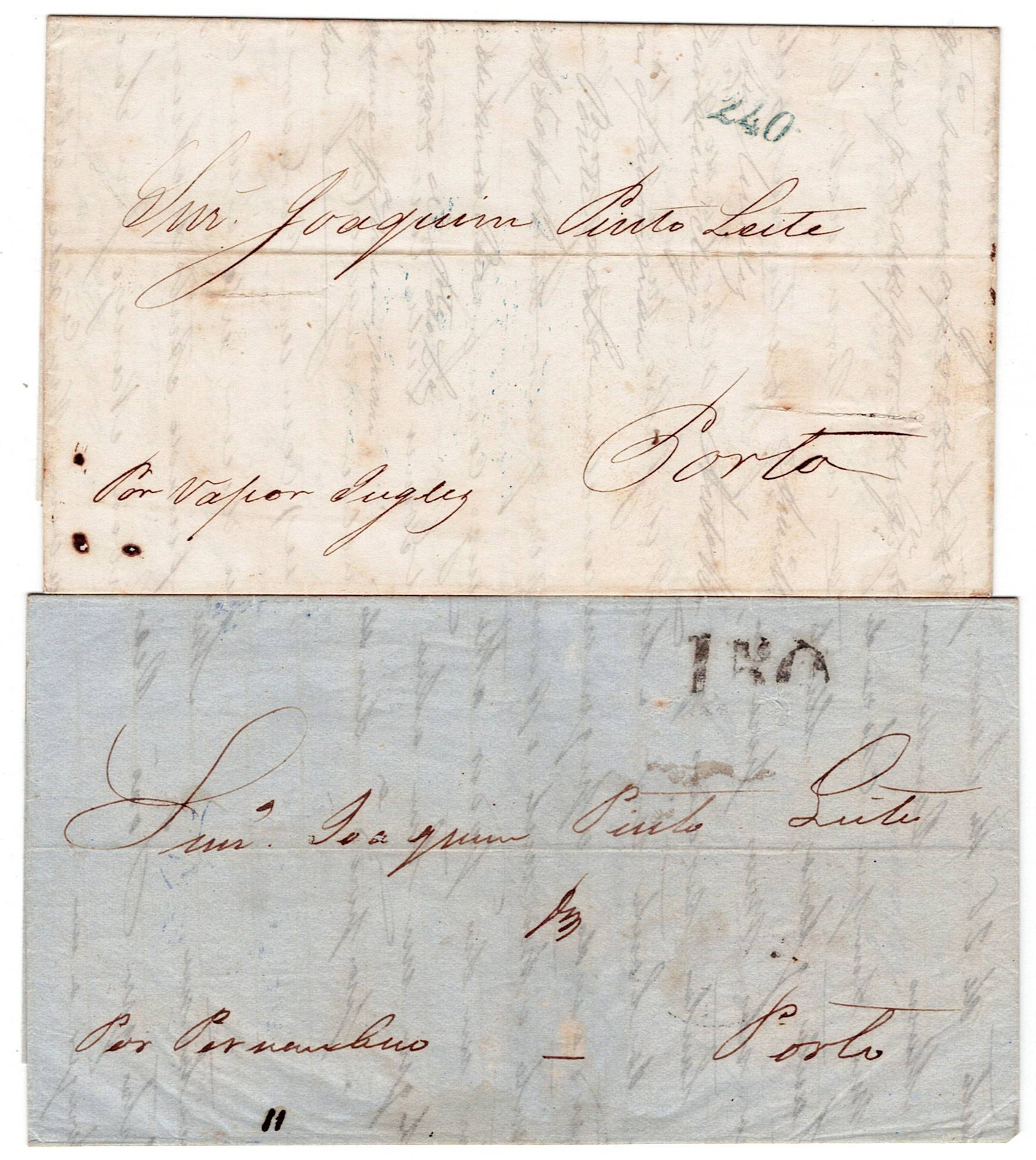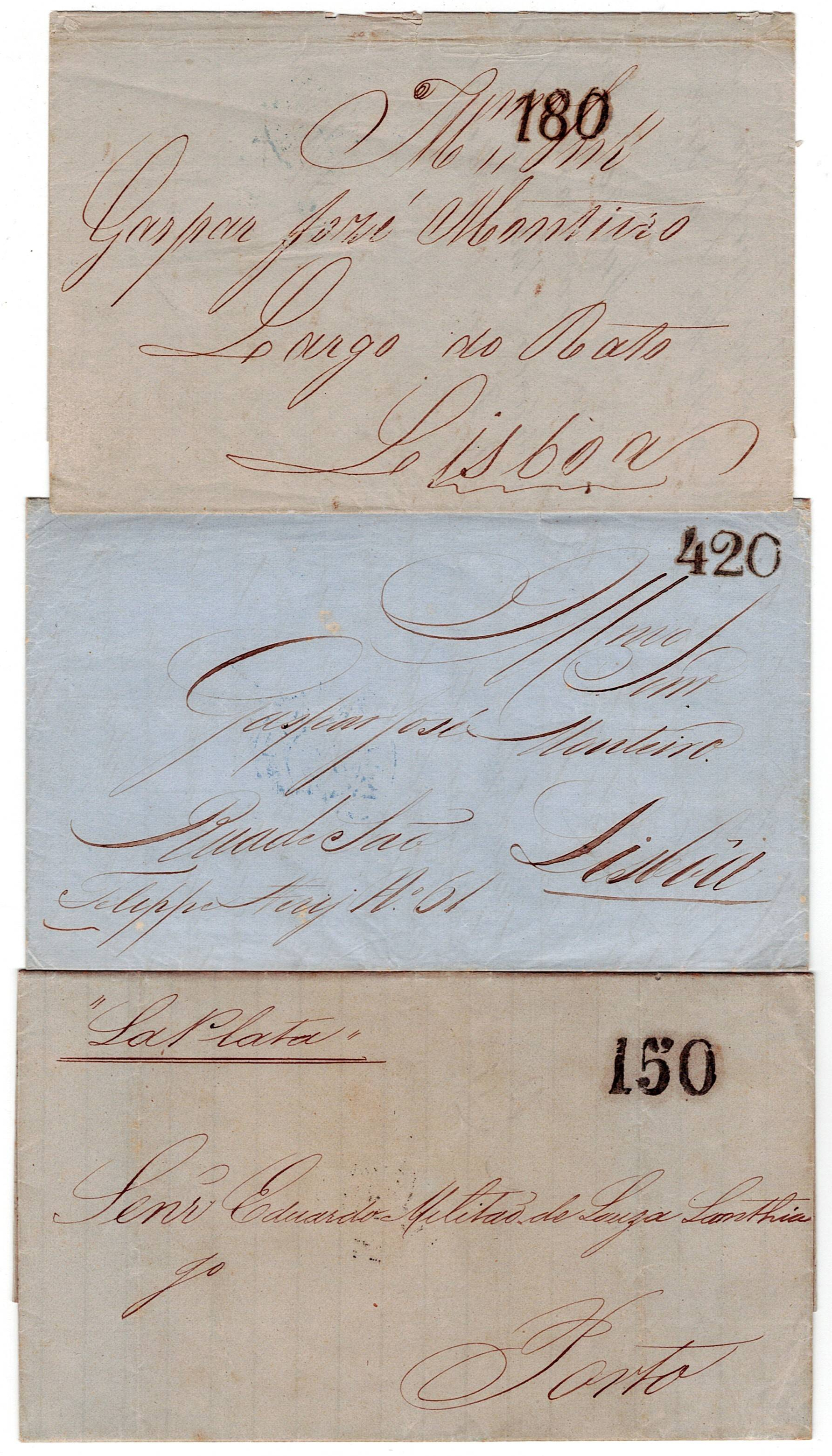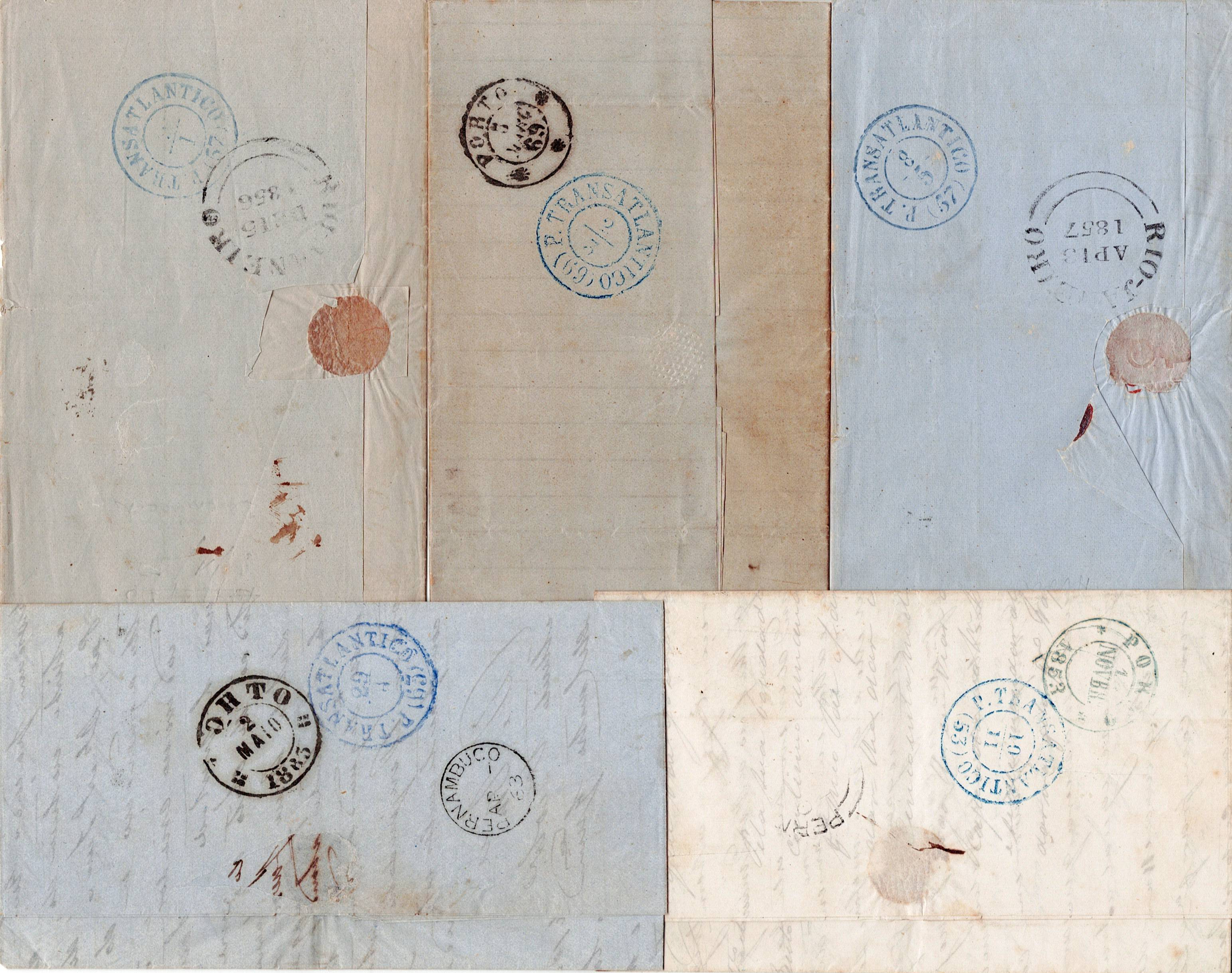 1304 imageSea Mail. Brazil. Lot of 5 letters from Brazil (Pernambuco, Rio de Janeiro), transported by Royal Mail English packet ships, all with the transatlantic P. markings in blue, dated 1853 to 1869, and destined for Porto. Postage payable in Portugal of 180, 240, 150, 420.(Image 1) (Image 2) (Image 3)