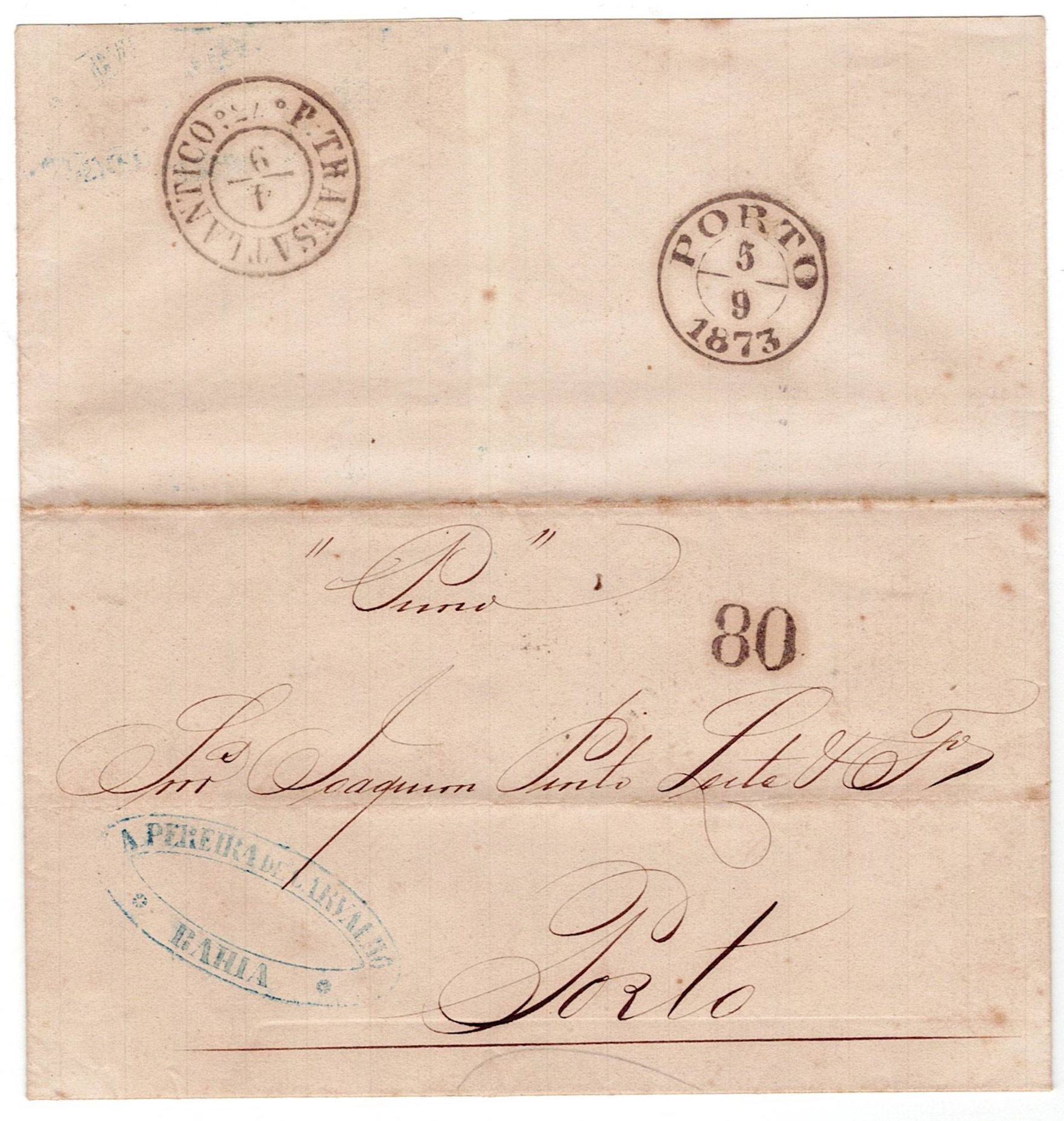 1305 imageSea Mail. Brazil. Letter from Baía 16.8.1873, by “PUNO” to Porto, Arrival in Lisbon on 4.9, mark P. Transatlantic in black, postage 80 reis, arrival in Porto on 5.9(Image 1)