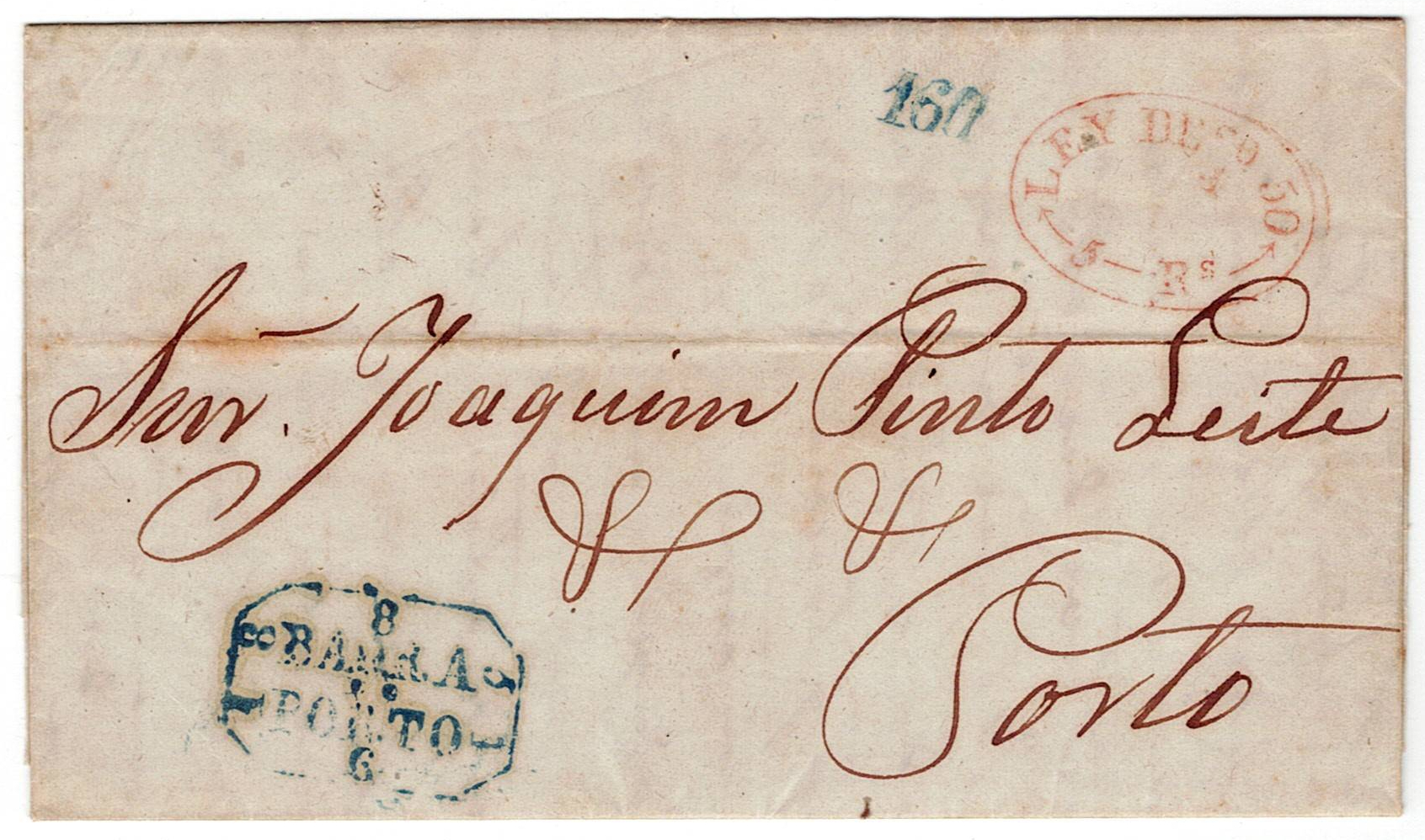 1307 imageMaritime Mail. Brazil. Letter from Pernambuco, dated 18.4.1851, addressed to Porto, where it arrived on 8.6, entry mark BARRA DO PORTO, applied the postage of 160 reis and 5 Reis of LEY of 20/4.(Image 1)