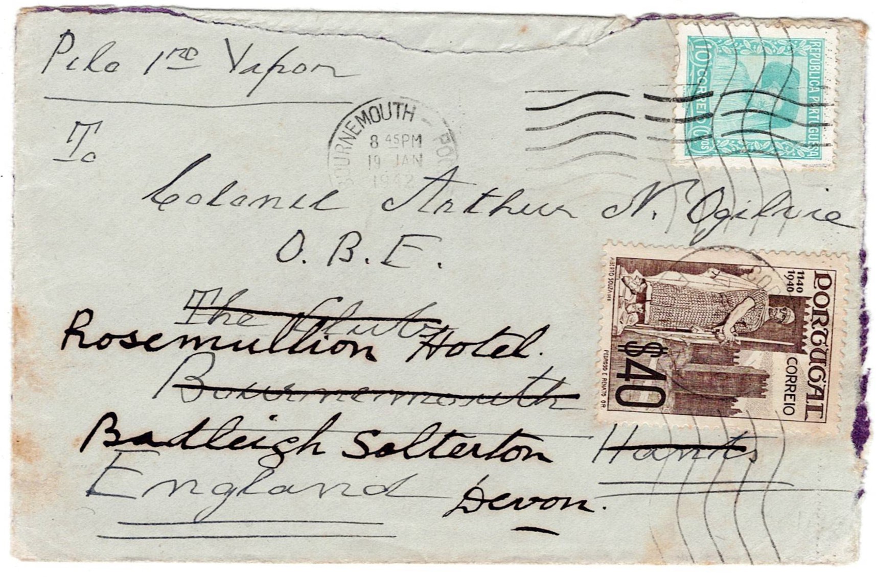 1308 imageSea mail. Madeira. Letter sent from Funchal on 27.9.1941, to England, postage of 1$90, with the annotation “by the 1st steamer”. From Bournemouth, where it arrived on 19.1.42 (3 and a half months!) it was forwarded to Devon.(Image 1) (Image 2)