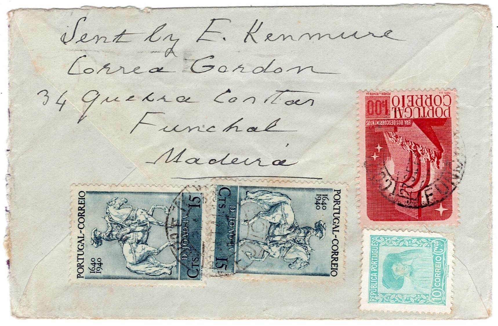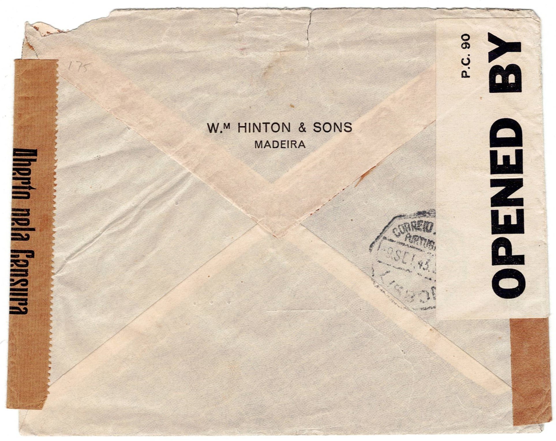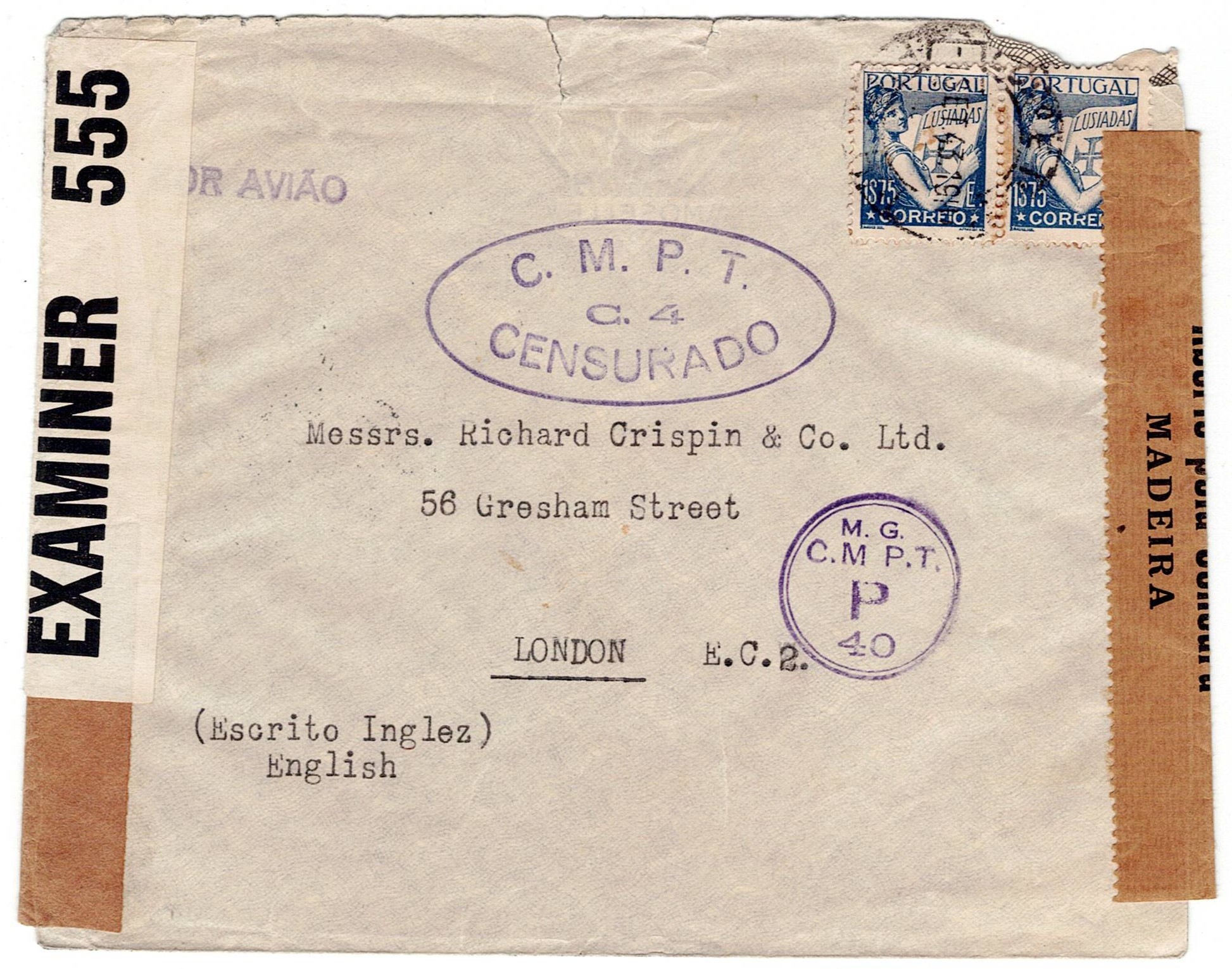 1317 imagePostal history of Madeira. Military censorship. 1943. Letter sent from Funchal on 1.9.1943, postage of 3$50 (pair of 1$75 Lusíadas), to London. It was censored in Funchal, marks CMPT/C.4/CENSURADO, and MG/CMPT/P/40, it was opened by the censor and closed with a ribbon OPENED BY CENSORSHIP /MADEIRA, and opened again upon arrival in England.(Image 1) (Image 2)
