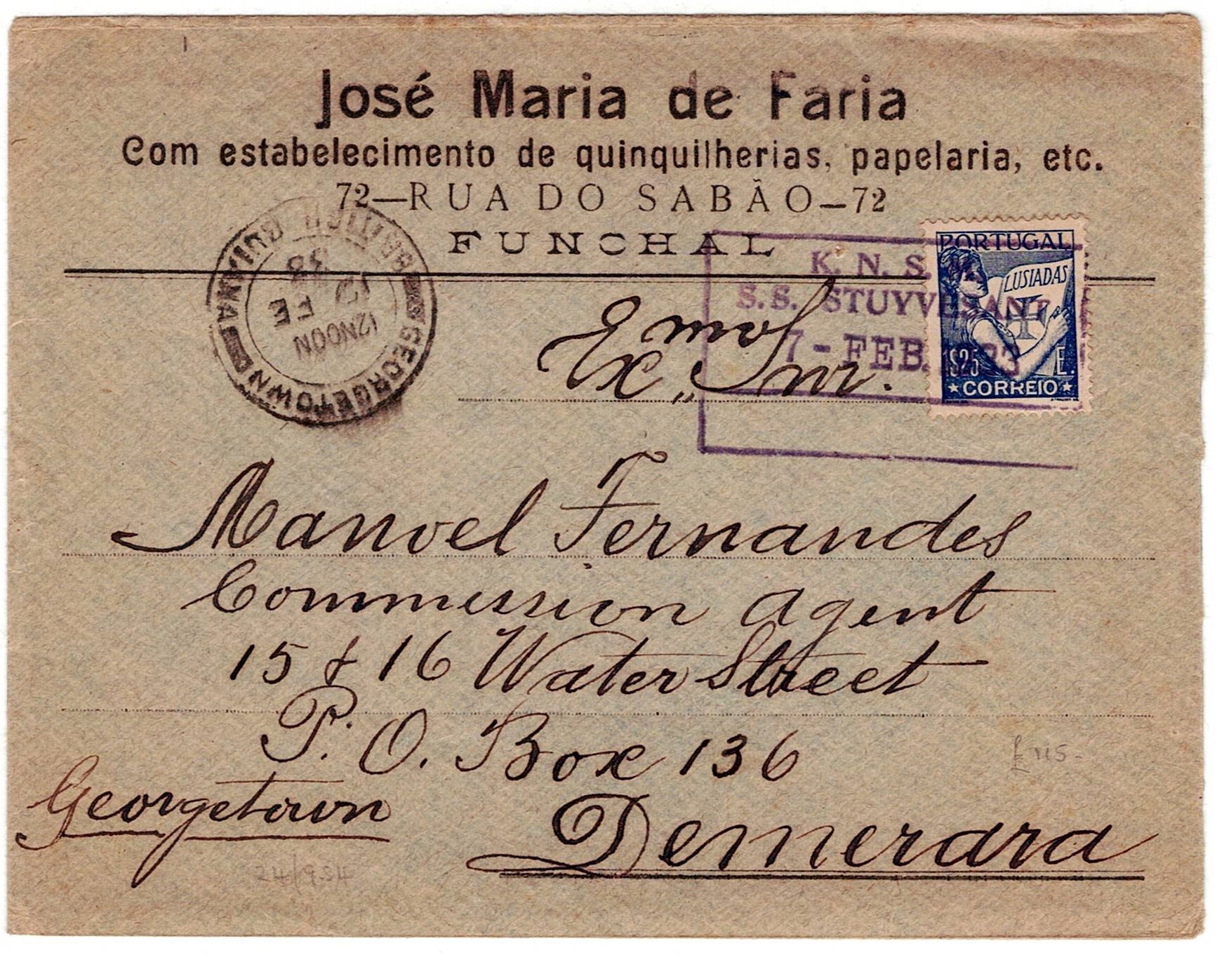 1309 imageSea mail. Madeira. 1933. Letter sent from Funchal, postage 1$25 Lusíadas, to Demerara, from the Manuel Fernandes correspondence, by the Dutch steamer KNSM /SS STUYVESANT/7 FEB1933, arrival on 12.2.MB(Image 1)