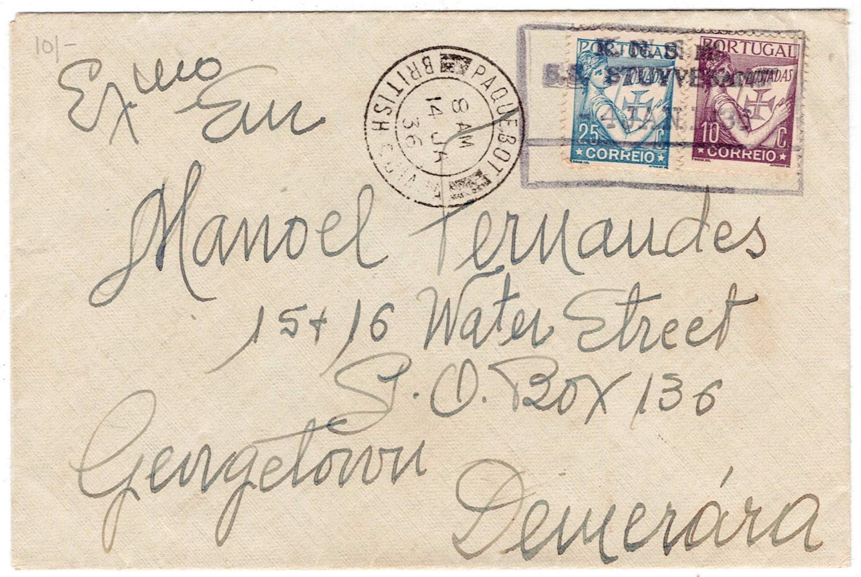 1310 imageSea Mail. Madeira. Letter from Madeira to Demerara, 35-cent Lusiad postage, issued aboard the SS Stuyversant 4 January 1936, arrival date 14 January 1936(Image 1)