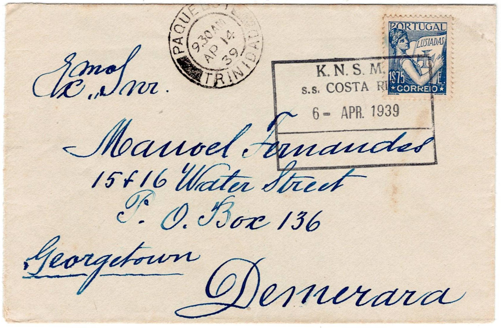 1311 imageSea Mail. Madeira. Letter from Madeira to Demerara, postage 1$75 Lusíadas, launched aboard the SS Costa Rica, April 6, 1939, arrival date April 14, 1936(Image 1)