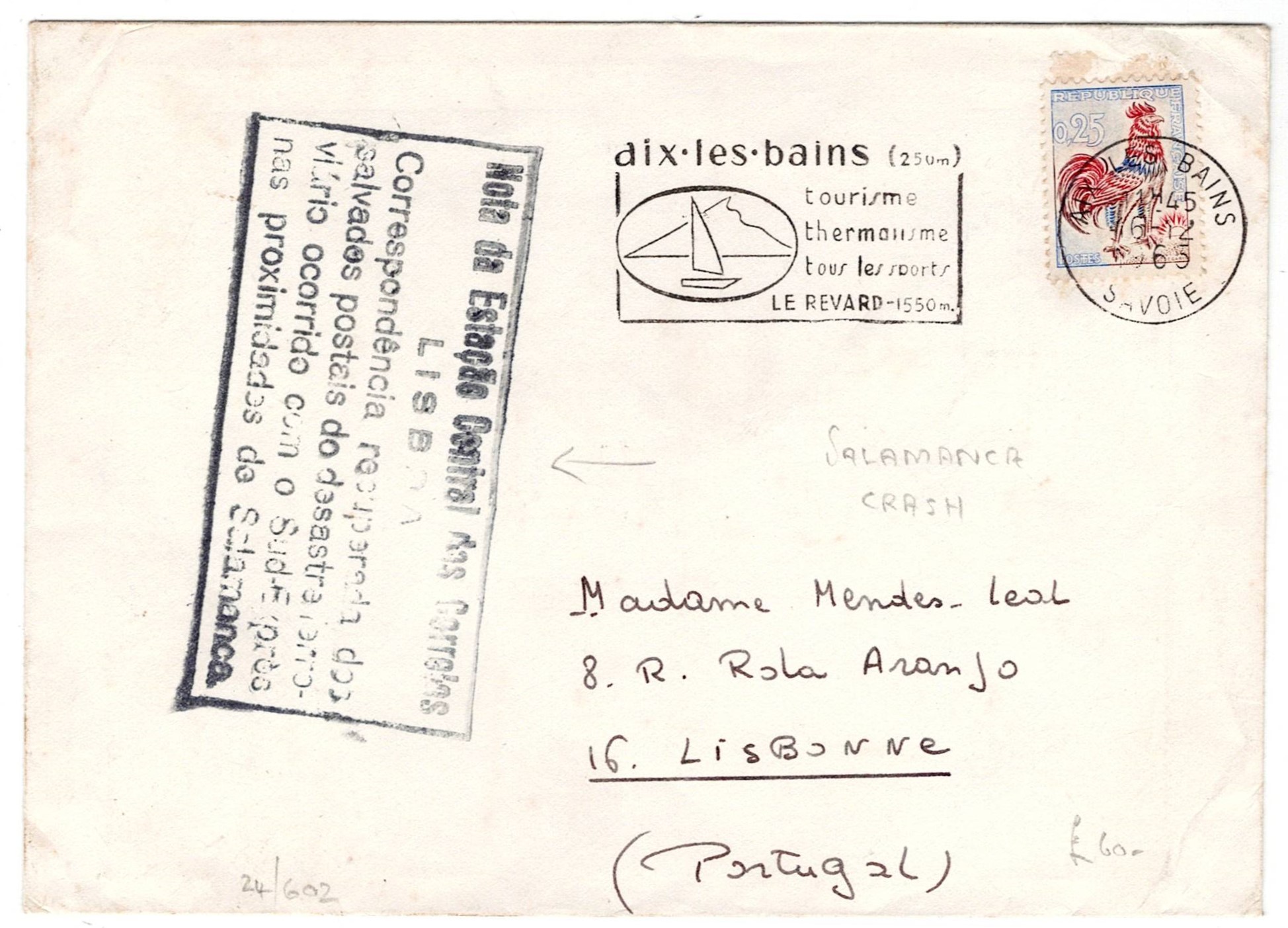 1312 imageRailway mail. Portugal Spain. Salvage from the Sud Express train that crashed in Salamanca, in a letter from France on 6.12.1965, to Lisbon. Salvage mark from the Lisbon Central Post Office(Image 1)