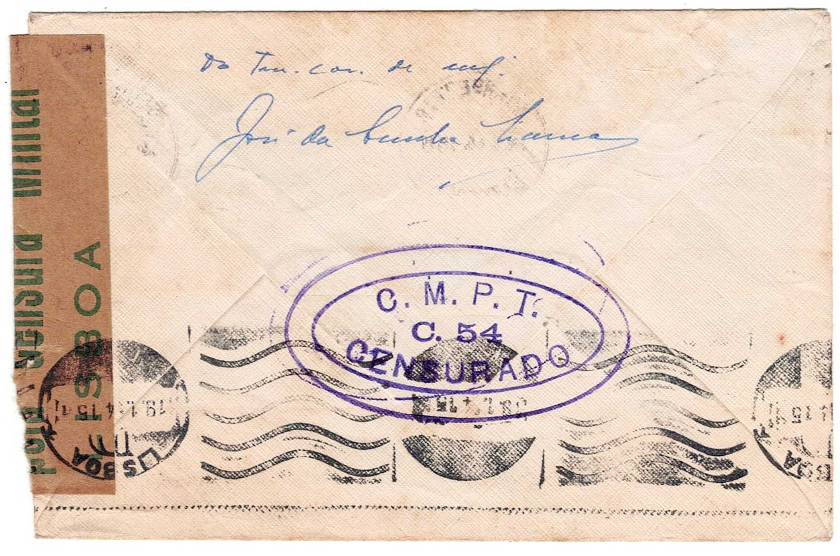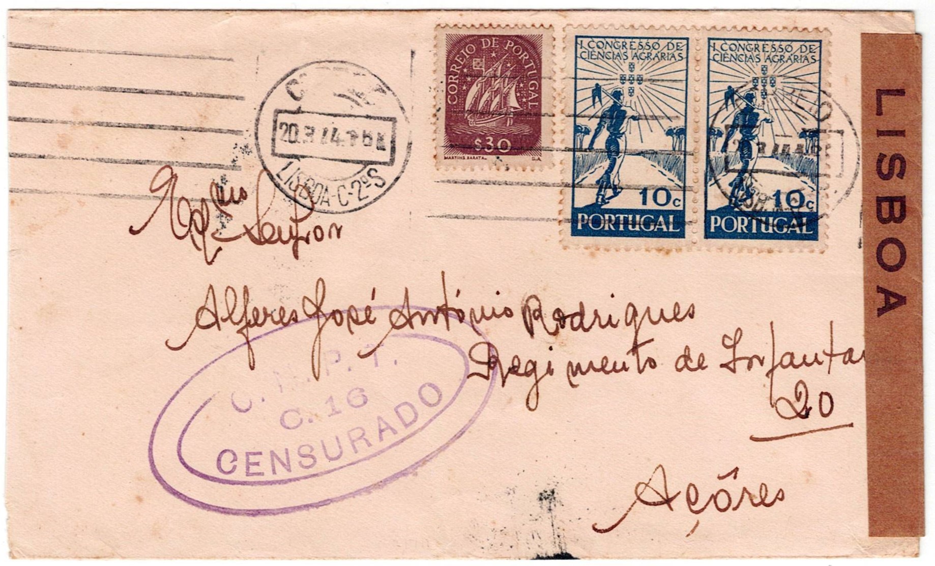 1314 imagePostal history. Portugal. Military censorship. 1944. Letter sent from Lisbon on 20.3.1944, to the Azores, postage of $50. It was opened by the censor in Lisbon, and its arrival in Ponta Delgada was censored, marks CMPT/C.16/CENSORED.(Image 1) (Image 2)