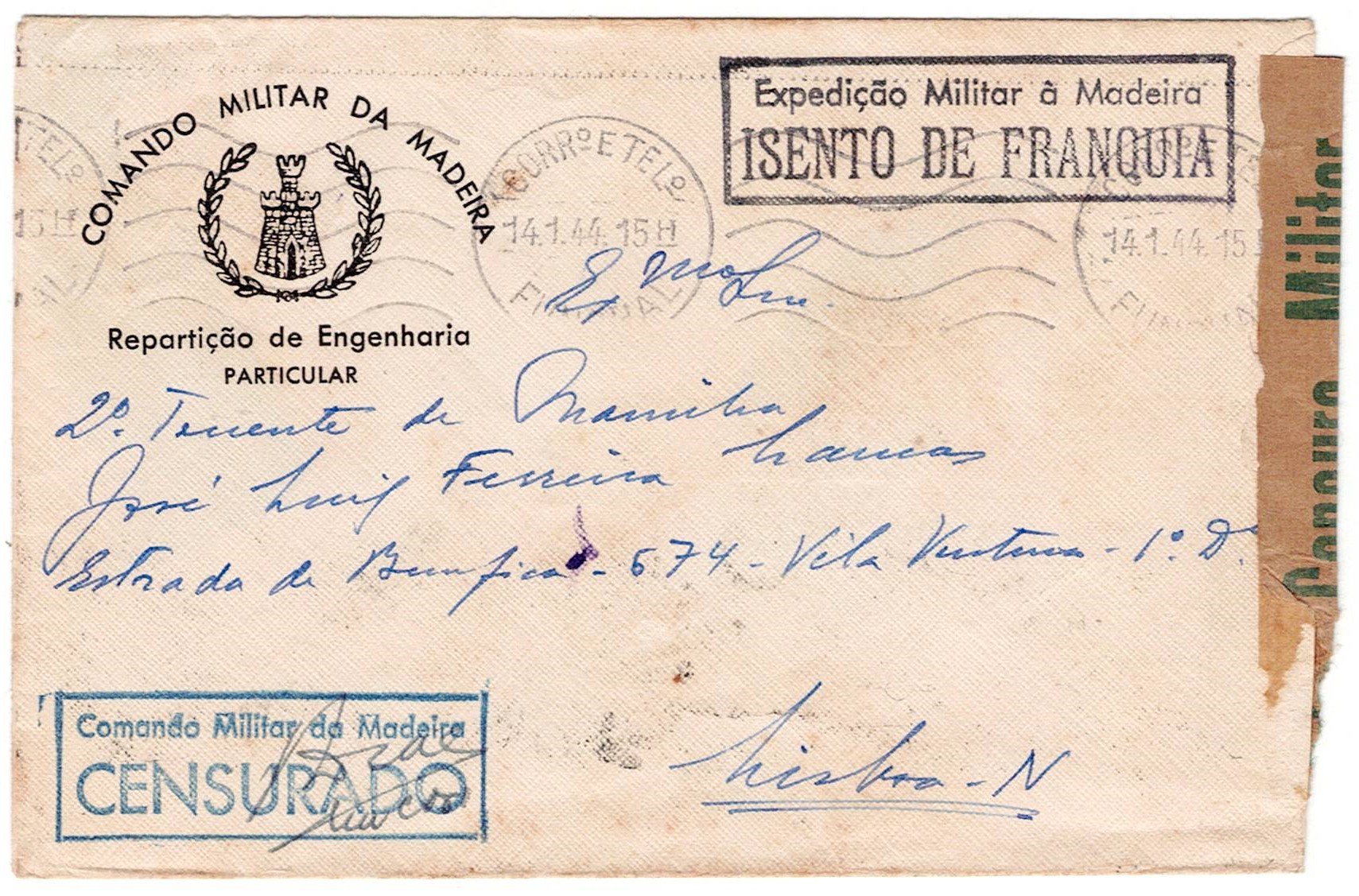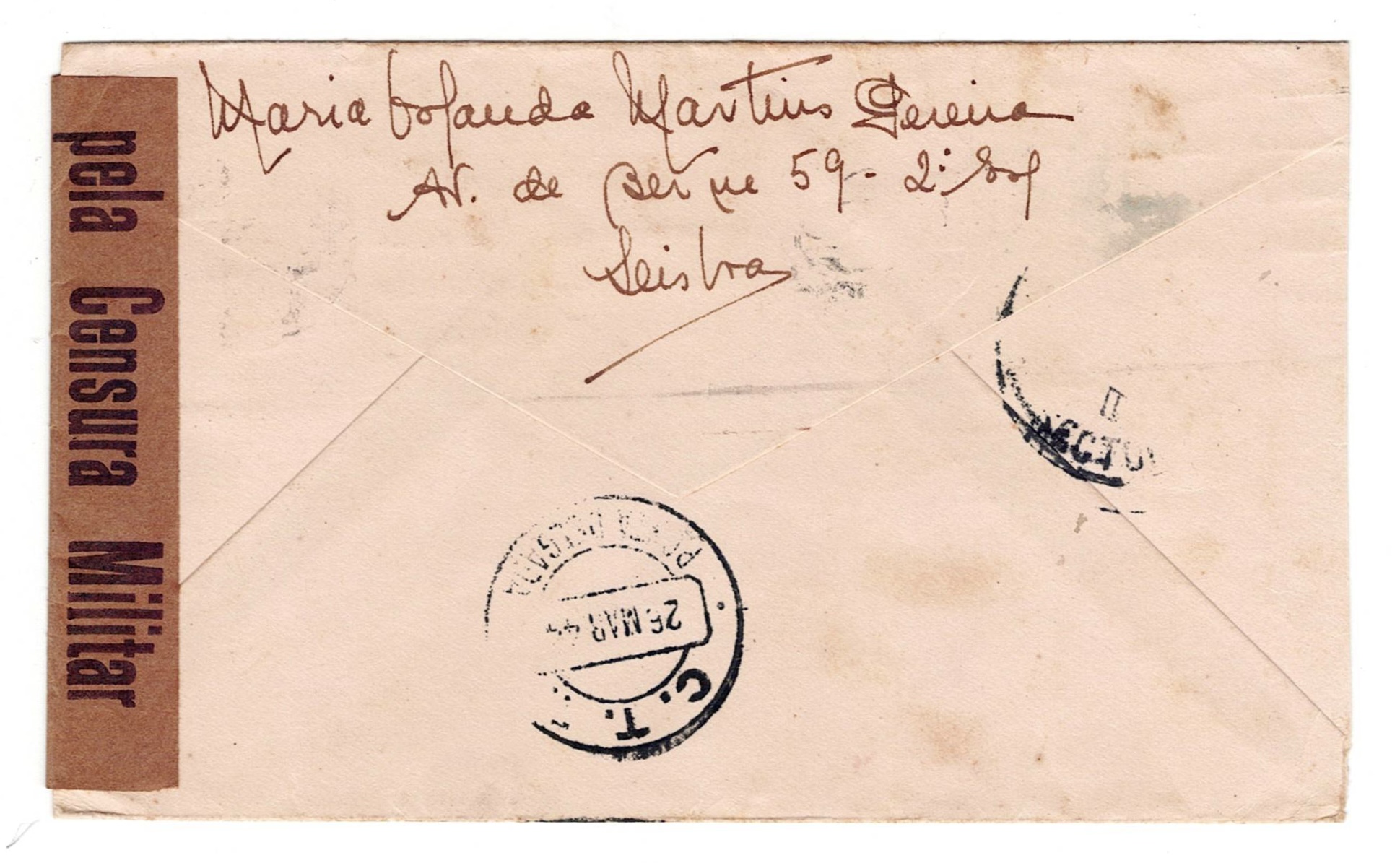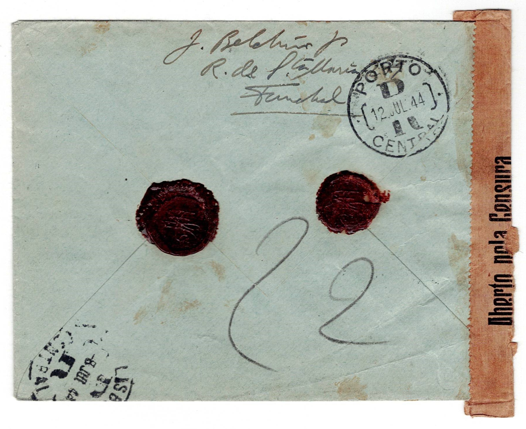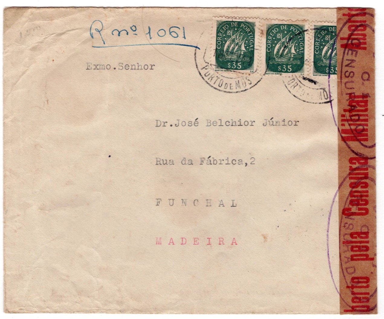 1316 imageLetter sent (16.2.1944) registered R no. 1061 by the Porto de Mos post office. It passed through Lisbon (19.2.), where it was opened by the censor and sent to Funchal (Madeira Island - 24.2.). Stamps costing 1$05 (50c. postage + 50c. registration premium — excess 5 centavos).(Image 1)