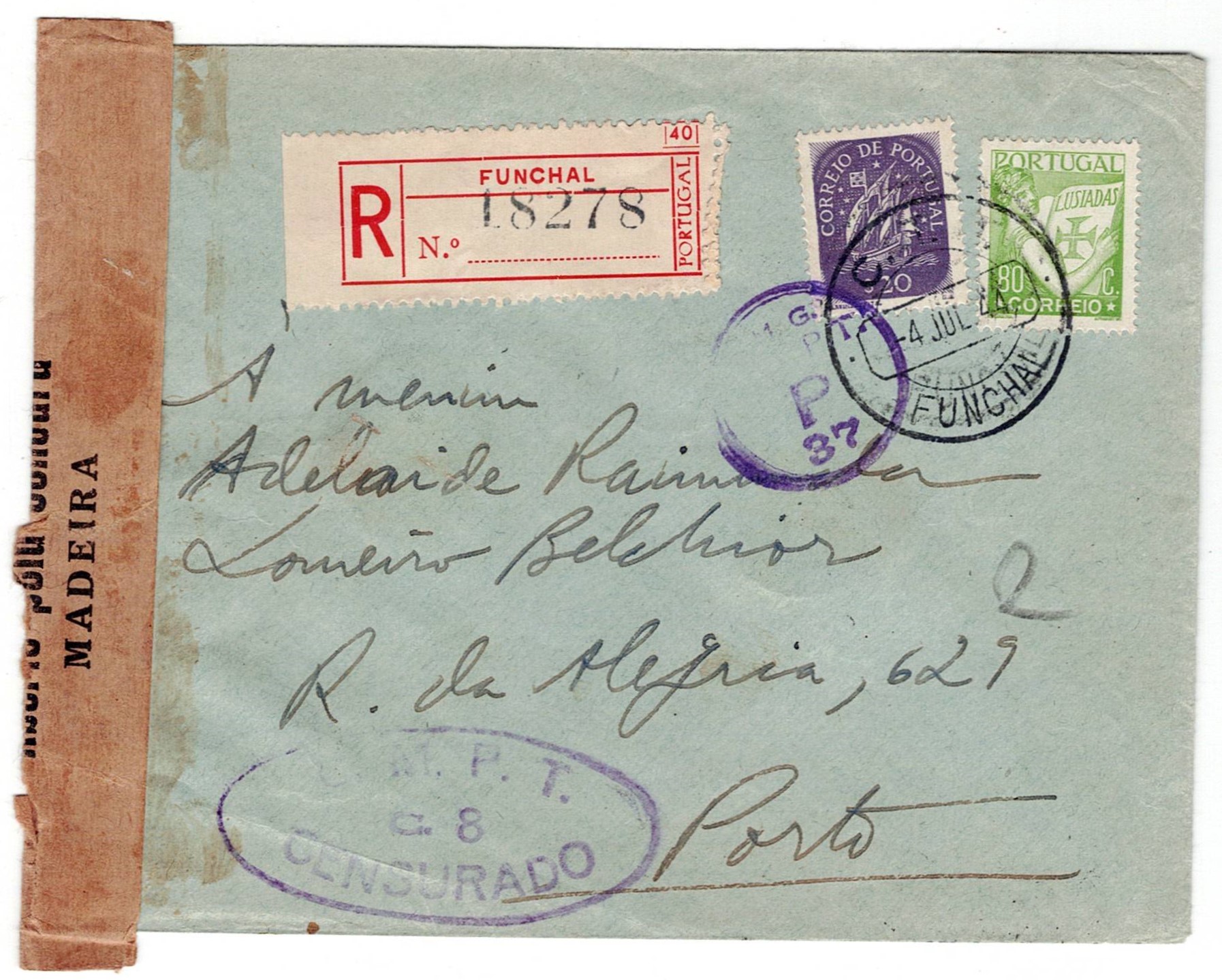 1318 imageMadeira postal history. Military censorship. 1944. Registered letter, sent from Funchal on 4.7.44, postage of 1$00 (20 cent Caravela and 80 cent Lusíadas stamp) to Porto. It was censored in Funchal, marks CMPT/C.8/CENSURADO, and MG/CMPT/P/37, it was opened by the censor and closed with a ribbon OPENED BY CENSORSHIP /MADEIRA, arrived in Porto on 12.7.(Image 1) (Image 2)