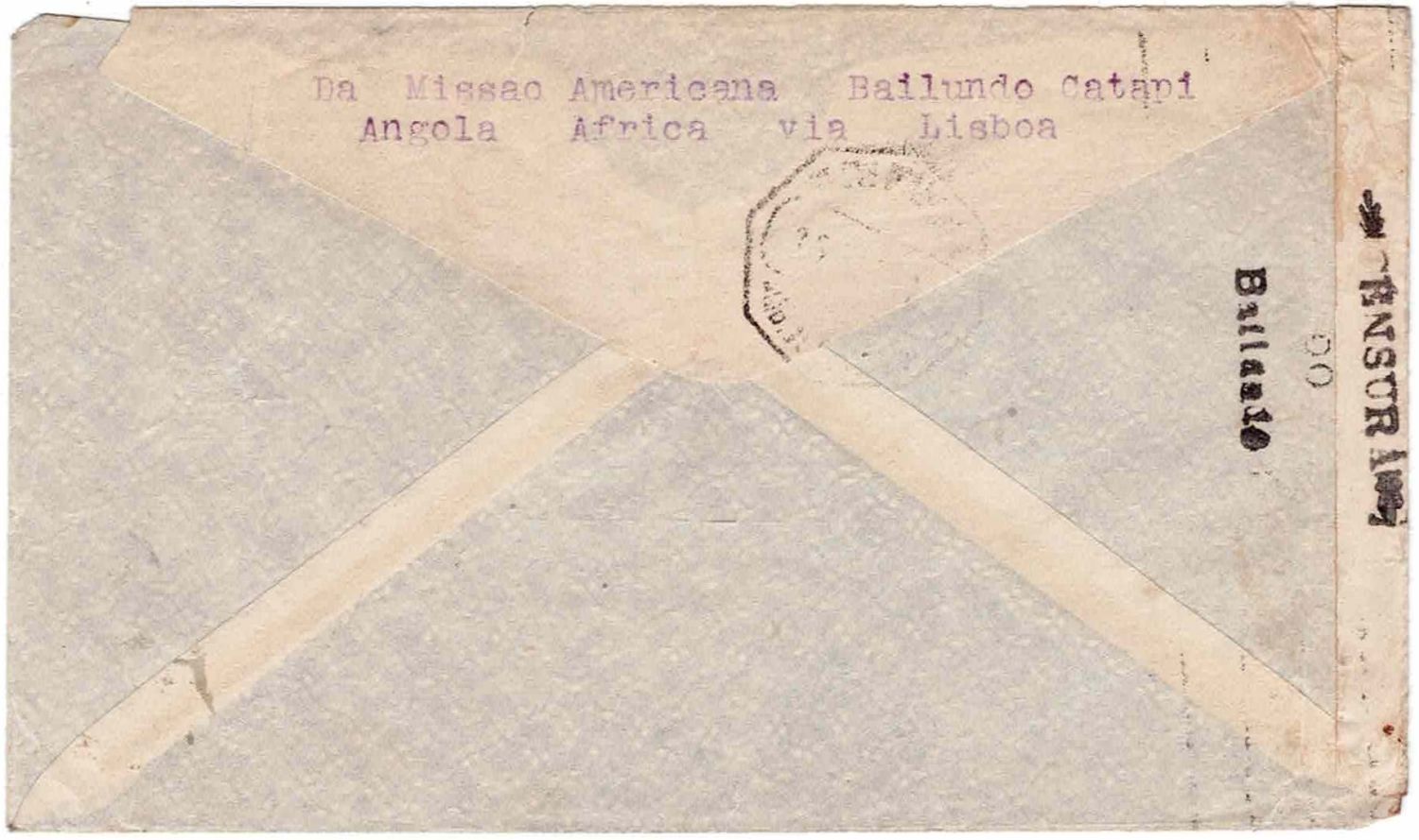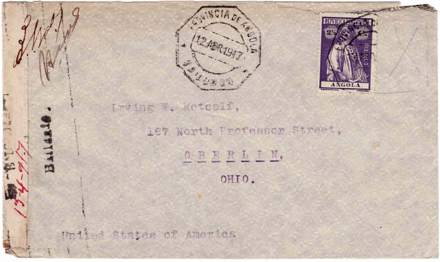1319 imageMilitary censorship. Angola. Letter sent from Bailundo on April 12, 1917, incomplete 2.5-cent postage (one stamp missing) to Oberlin, Ohio, in the United States. It was opened by the censor and sealed with a ribbon. "Bailundo Censorship," dated April 13, 1917, initialed by the censor. A very rare censorship letter from Angola, complete and dated.(Image 1) (Image 2)