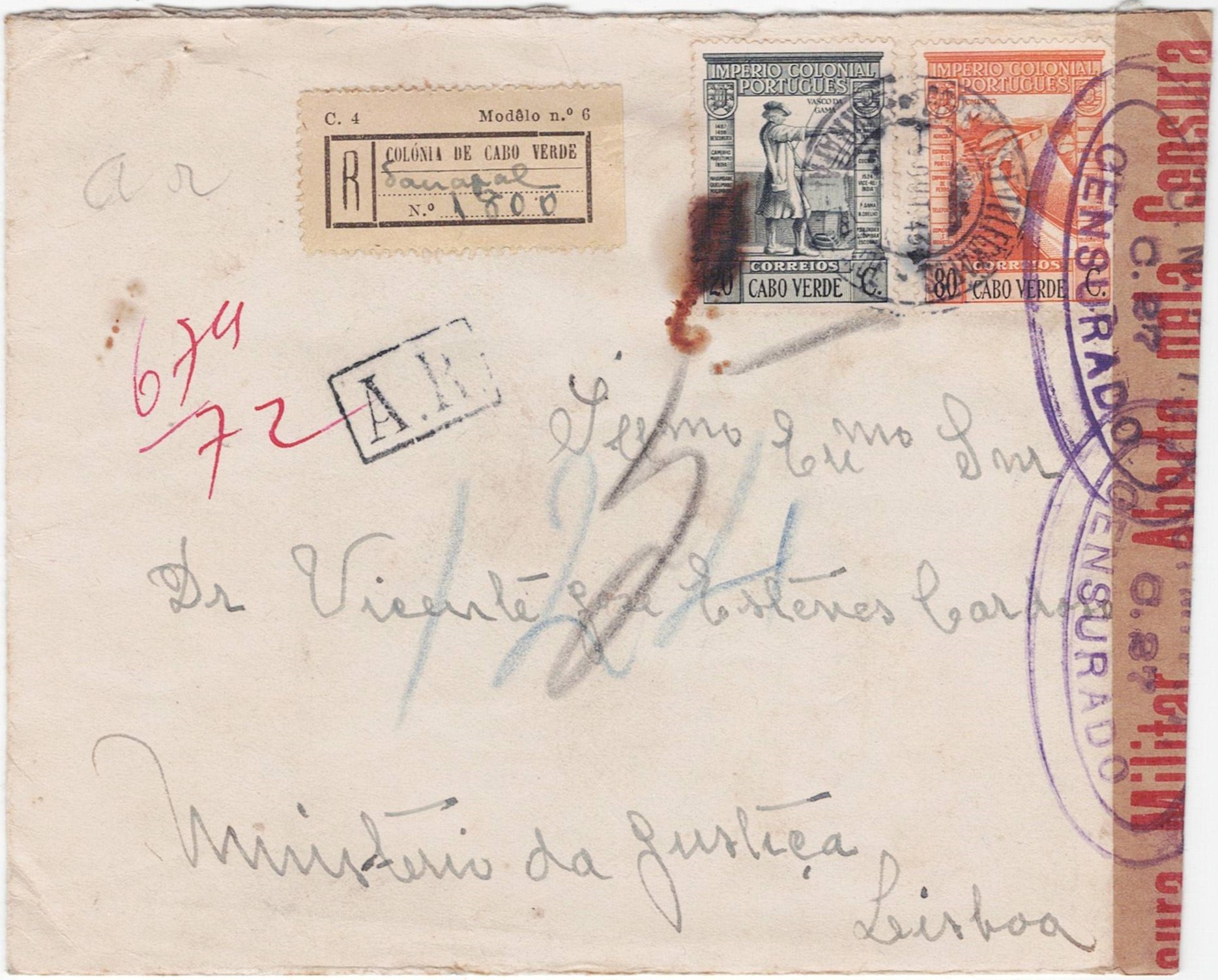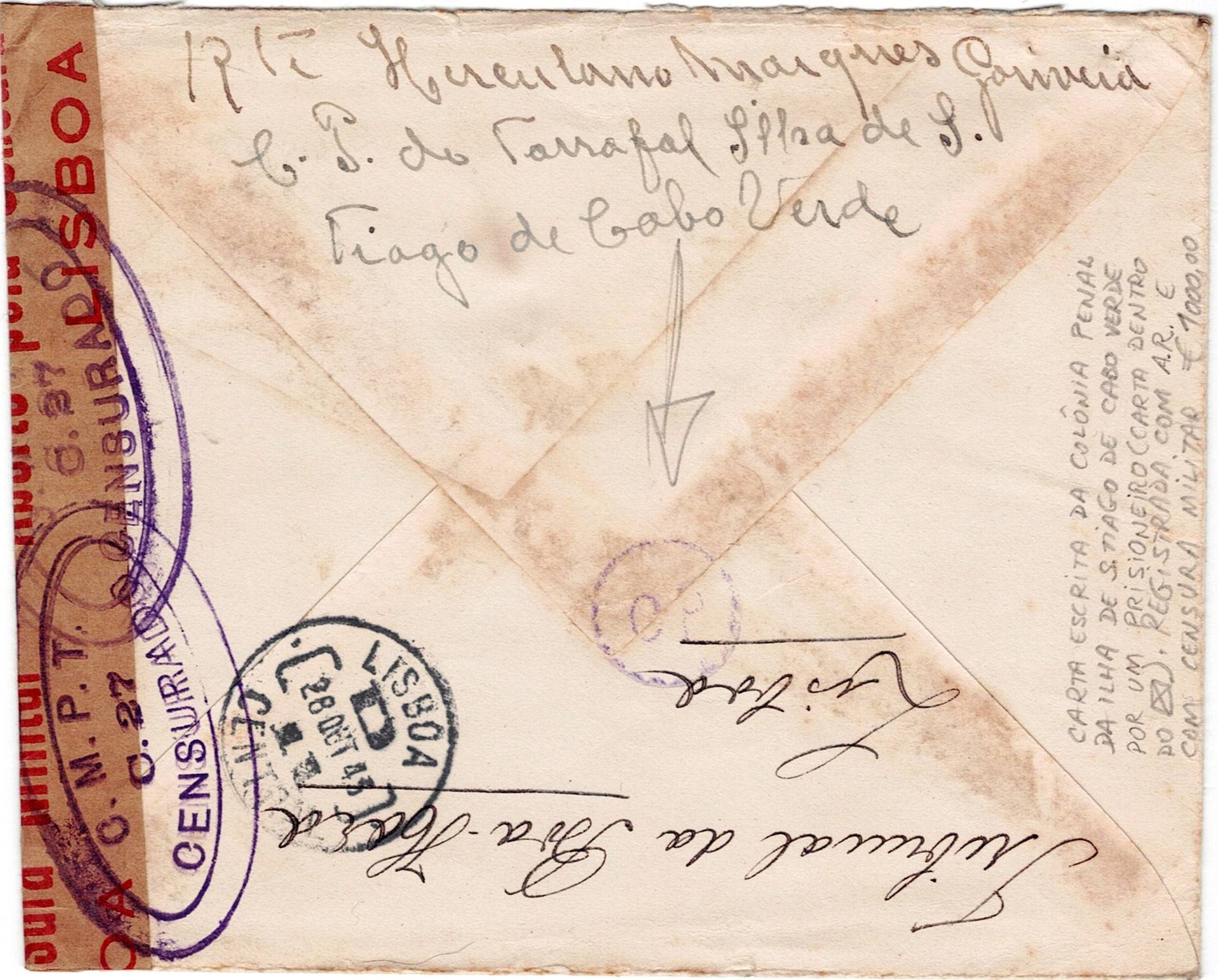 1320 imageCape Verde. Tarrafal penal colony. Registered letter with acknowledgement of receipt in Tarrafal on 16.10.1943, with censorship mark CP (Penal colony), censored in the city of Praia where it was opened by the censor, Censor No. 27, heading for Lisbon, arriving on 28.10. Enclosure recounting the letter in which the sender states, “far from this pestilent environment where I have been trapped for seventy-four months now, waiting for justice to be done.” Herculano Marques Gouveia, joined the Portuguese Expeditionary Corps in 1917 as a soldier in the 4th Company: he embarked on 21 April and returned to Portugal on 12 November on the auxiliary cruiser “Pedro Nunes”. A businessman, he was arrested by the PSP in Lisbon on 1 May 1933 and handed over the following day to the PVDE, “on suspicion of being involved in the throwing of some explosive bombs in Largo do Terreiro do Trigo”, where he lived. Released on 10 May, he was arrested again on 22 March 1937, “for investigation”. Taken incommunicado to a police station, he was transferred from the 27th police station (Pedrouços) to Aljube on 28 April and, on 5 June, embarked for Cape Verde without having been tried.
