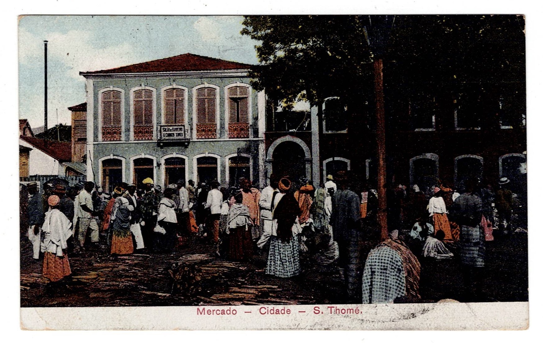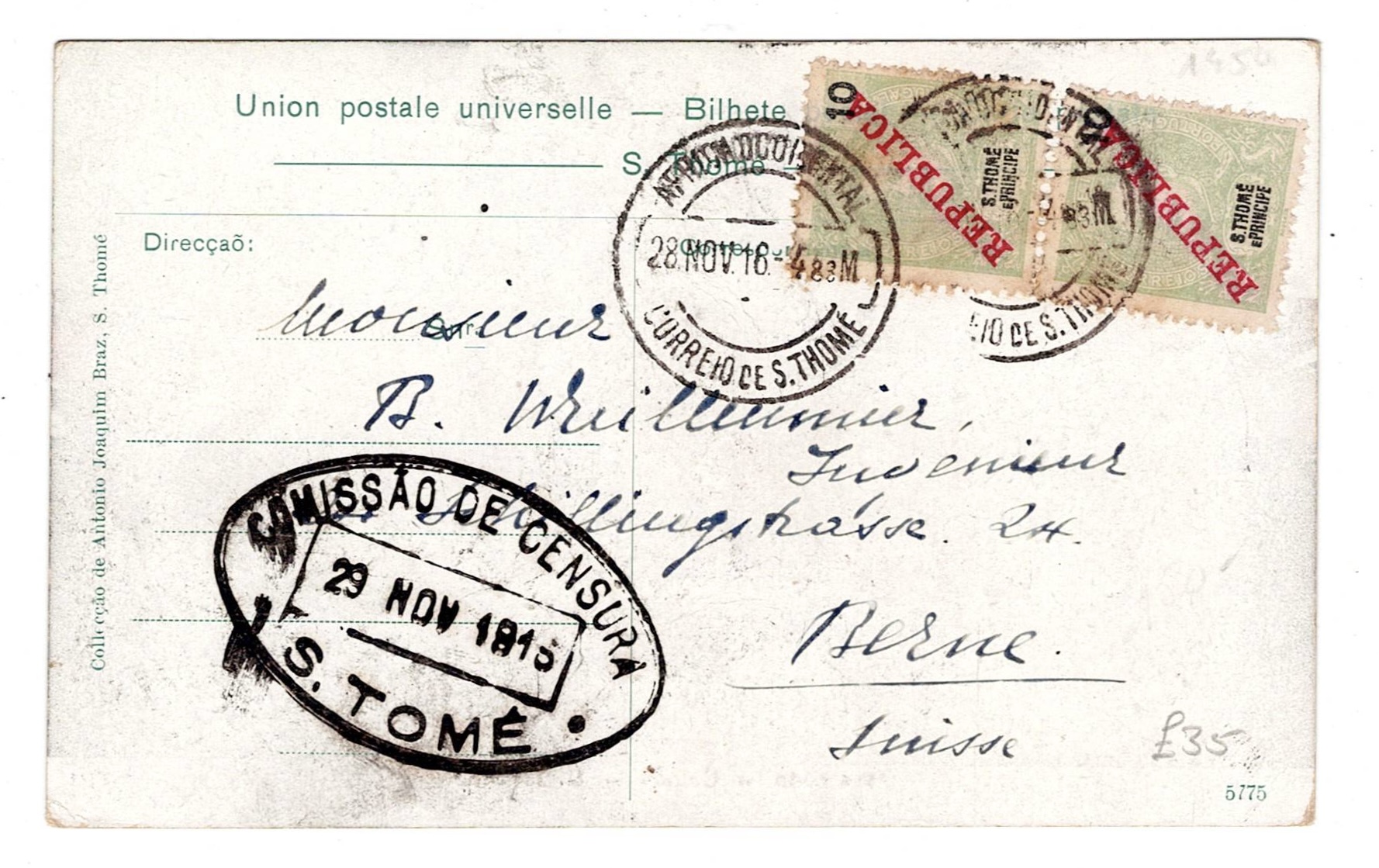 1321 imageMILITARY MAIL. S. Tomé. WW1 CENSORSHIP. Illustrated postcard of the S. T market, 20 reis postage to Switzerland, dated 28.11.1916, endorsed by the CENSORSHIP COMMITTEE on 23.11.1915.(Image 1) (Image 2)