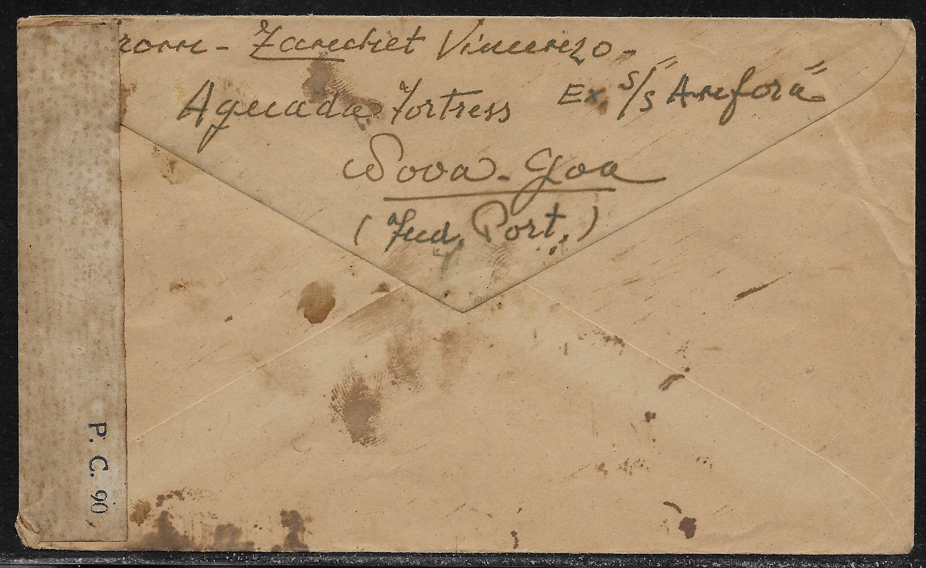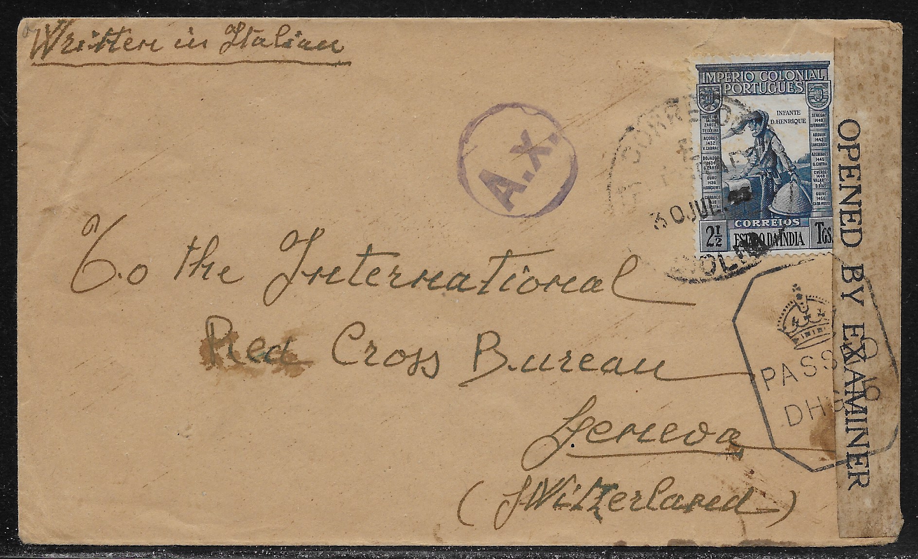 1322 imagePort. India 1943 censored cover from Aguada Fortress Goa, to the International Red Cross Committee in Geneva Switzerland, franked with a single 2 1/2 tangas Imperio issue (CE 356). The cover was posted by a crew member of the S.S. Anfora. Censored in Belgaum “DHG/5” + a German “A.X.” censor mark applied in Paris. Scarce “Siolim” village CDS ties the stamp. The Aguada Fortress was where civilian internees were interred in Goa and they didn’t have free franking privileges.(Image 1) (Image 2)