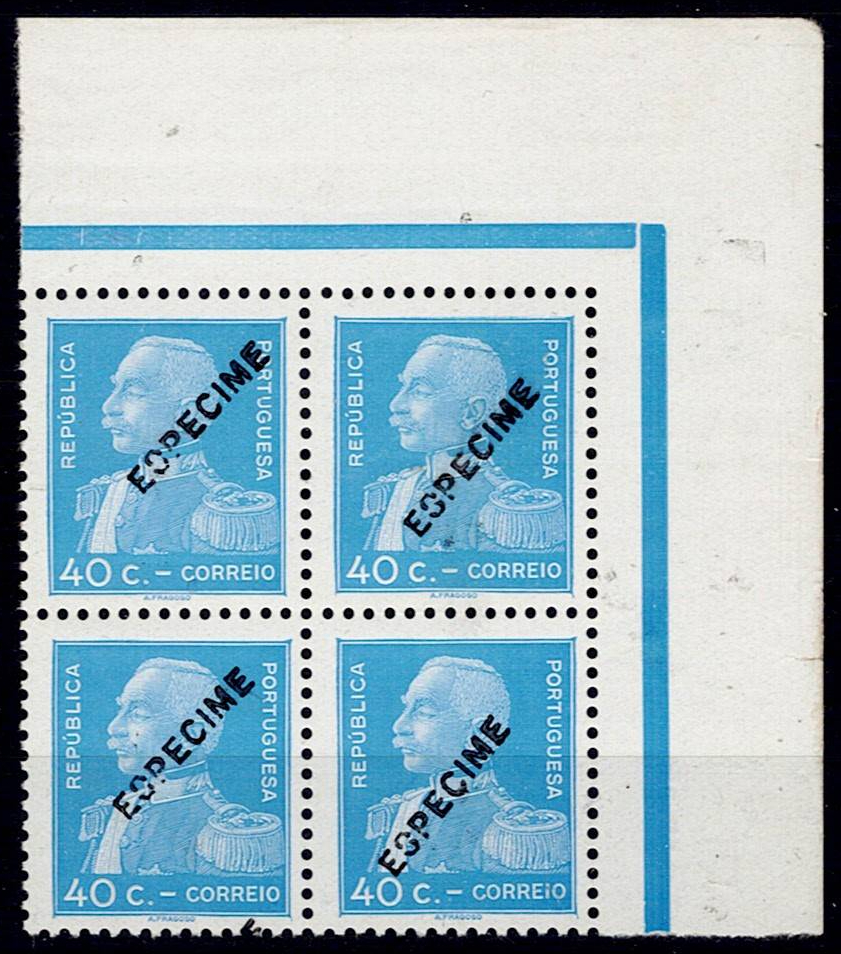 1344 imagePortugal * 1934 - General Carmona. Projected base issue. Drawings by Arnaldo Lourenço Fragoso. QUADRA corner of color proof sheet in sky blue, unapproved colors, notched, on porcelain paper, gummed and without hinge, with oblique overprint in black “SPECIMEN”. OM2137.(Image 1)