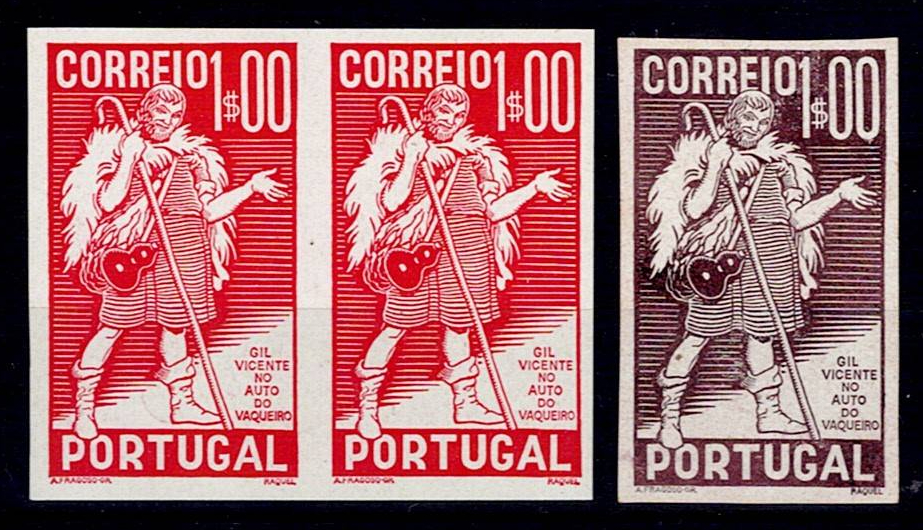 1345 imageProofs Portugal 1937 4th Centenary of the Death of Gil Vicente. Lot with 2 color proofs of stamp Mf#578, 1 unperforated PAIR in carmine (color approved for the rate) and 1 unperforated in dark brown, color approved for the rate of 0$40 but not for the 1$00. MB and R.(Image 1)
