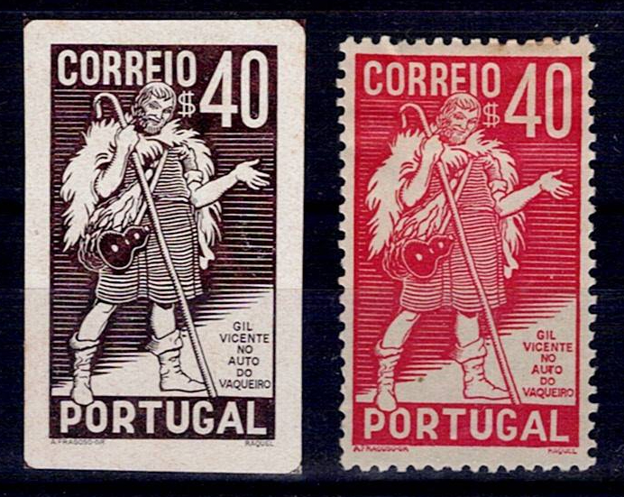 1346 imageProofs Portugal 1937 4th Centenary of the Death of Gil Vicente. Lot with 2 color proofs of stamp Mf#577, 1 unperforated in dark brown (color approved for the rate) and 1 perforated in carmine, color approved for the rate of 1$00 but not for the 0$40. MB and R.(Image 1)