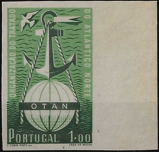 1347 imagePortugal * 1952 – 3rd Anniversary of NATO. MF749, 1$00. Color proof in dark green and light green, approved colors, right margin of sheet, not indented, with original hingeless gum, also considered as original indented stamps.(Image 1)