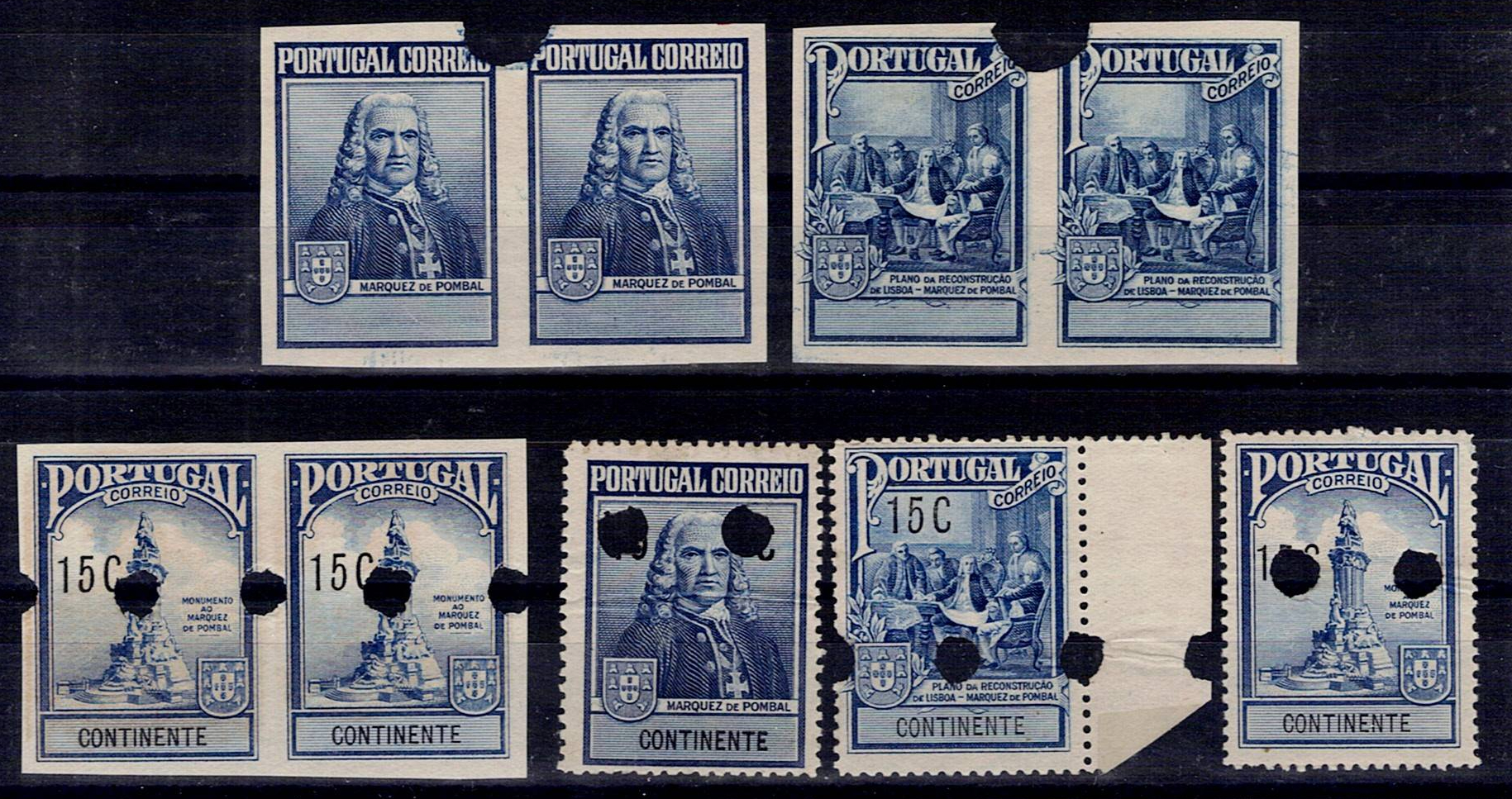 1349 imageProofs Portugal 1904 Postal Tax - Marques de Pombal. Set of 3 PAIRS and 3 individual proofs of stamps Mf#IPP18-20, 15 c. blue, issued by WATERLOW & SONS, TLD. 2 PAIRS of unperforated proofs without tax and with large security hole, 1 PAIR of unperforated proofs with tax and with normal security hole, + 3 perforated proofs with normal security hole, 2 of which have the tax printed, the other without tax and with leaf edge. Good.(Image 1)