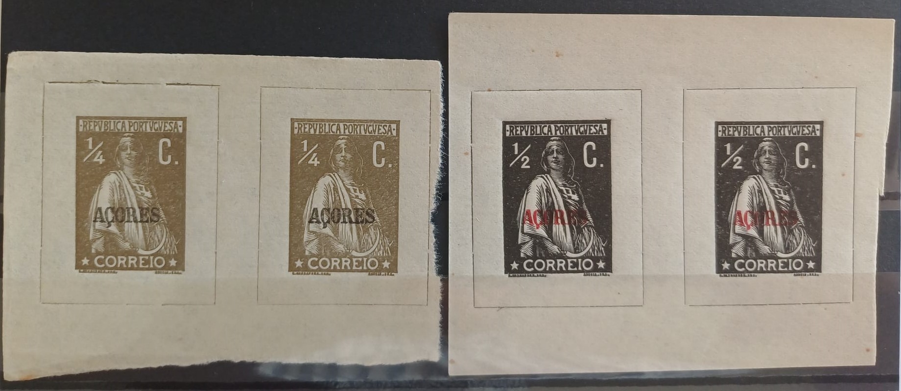 1351 imageAzores 1912-13 – Ceres with AÇORES overprint. MF149-50, 1/4 and 1/2 c, sepia and black. 2 strips with 2 colour proofs each, not dented, without gum, without defects or repairs, with good colour. Proofs considered to be clandestine.(Image 1)