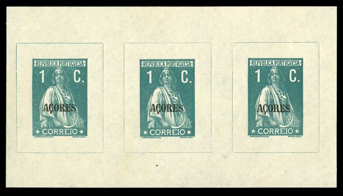 1352 imageAzores 1912-13 – Ceres with AZORES overprint. MF151, 1 c, dark green. Strip with 3 colour proofs, not dented, without gum, without defects or repairs, with good colour. Proofs considered to be clandestine.(Image 1)